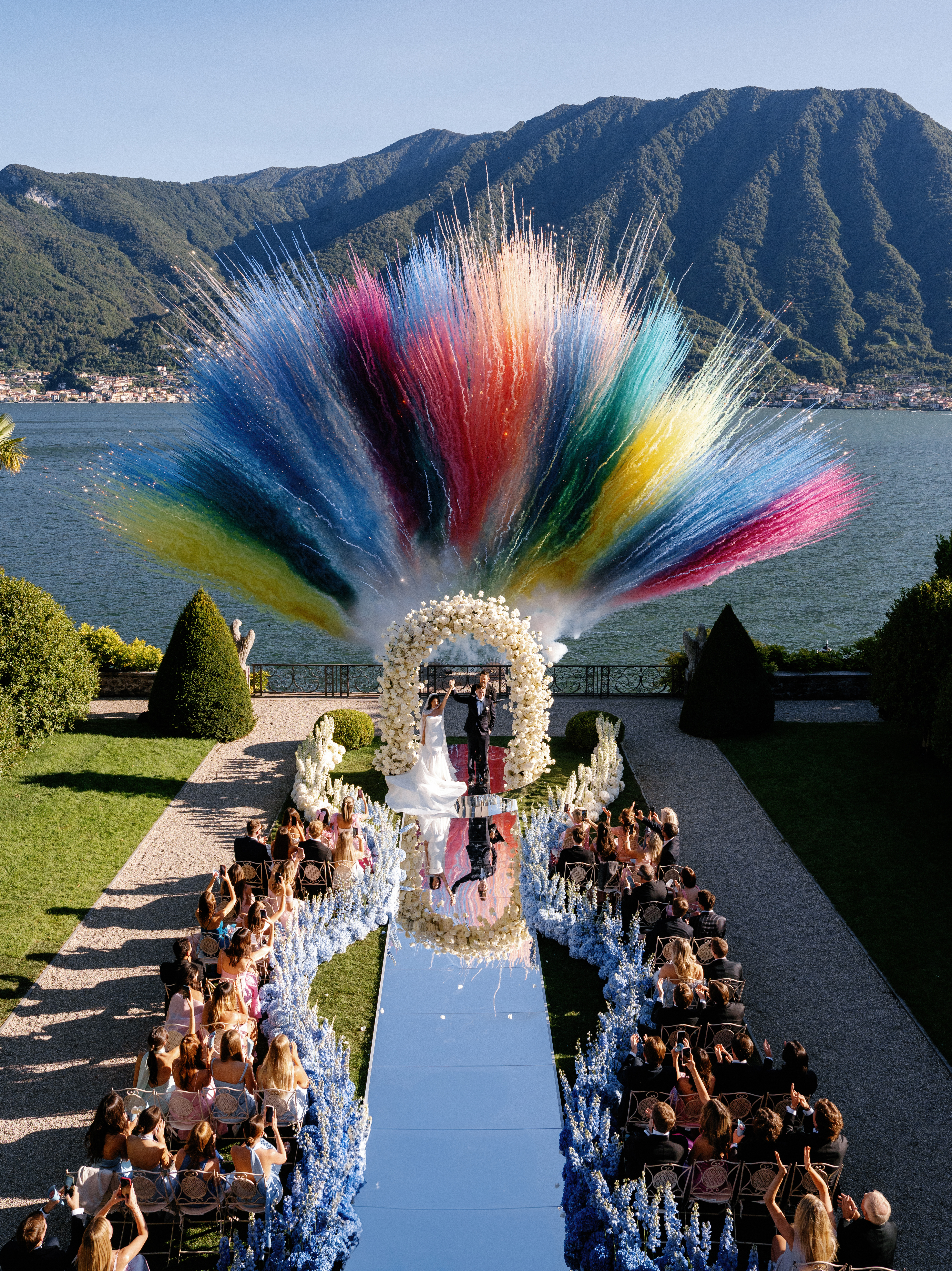 The real showstopper came at the perfect moment: "The carefully choreographed explosion of rainbow-hued daytime fireworks that lit up the sky the moment they shared their first kiss—leaving everyone breathless."