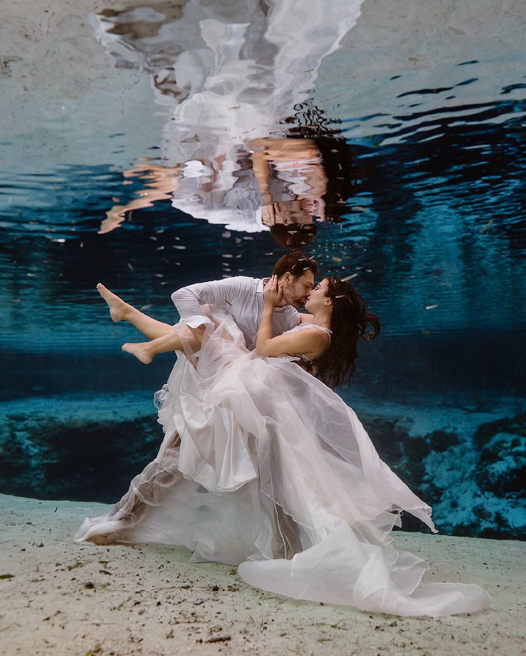 The choice of outfit and fabric matters significantly more for underwater shoots than for shoots on land. Heavy fabrics don't move well in the wind, but lightweight silks, chiffons and other flowing materials look beautiful when they catch the breeze. If you're doing beach or shoreline work, consider how the dress will photograph when wet — some fabrics cling in unflattering ways, while others become almost sculptural. Timing is everything: the light on water is soft and cool-toned in the morning, midday light can be harsh unless you use the boat's cover creatively, and the golden hour transforms water into liquid gold that photographs with extraordinary warmth.