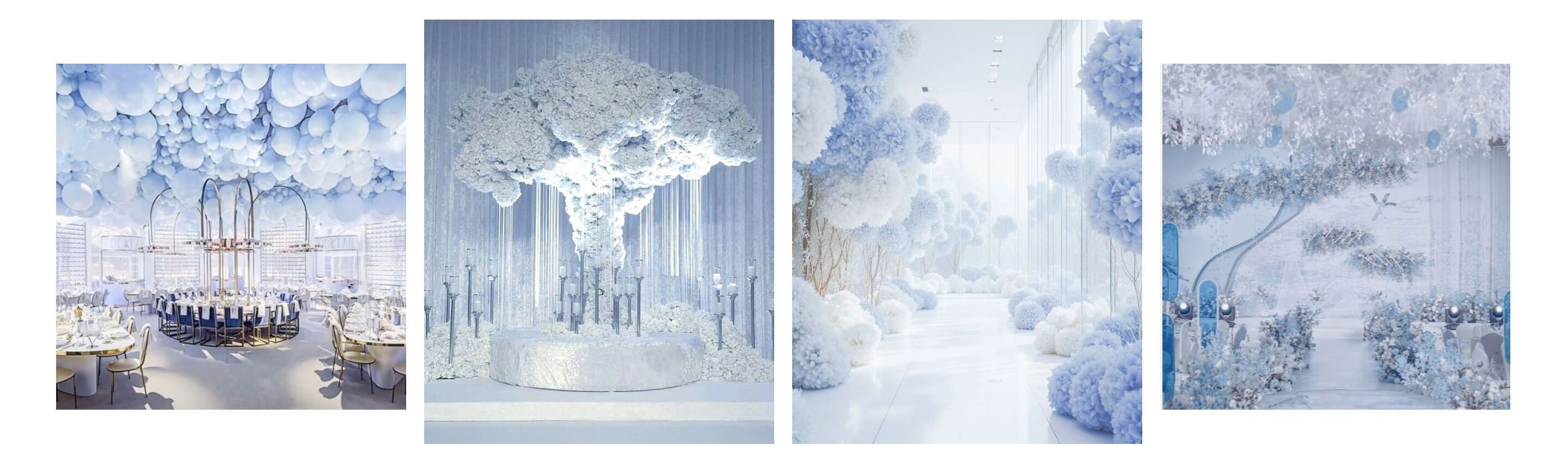 Creating an atmosphere filled with powder blue starts with soft textures and simple elegance. Begin by incorporating it into your key wedding elements — light powder blue tablecloths or runners, sheer blue drapery, or pastel blue floral arrangements set the tone for a calm and graceful space.Lighting plays an important role in enhancing the powder blue hue. Soft ambient lighting, such as string lights, chandeliers, or candles, create a gentle, romantic glow that complements the tranquility of powder blue. For florals, think of pale blue hydrangeas, baby’s breath, peonies, or white roses accented with blue ribbons or delicate silver foliage.Use natural materials, like wood or stone, alongside the soft powder blue to ground the overall design and create a balanced, organic feel. The goal is to evoke a serene atmosphere that invites guests to relax and enjoy the beauty around them.