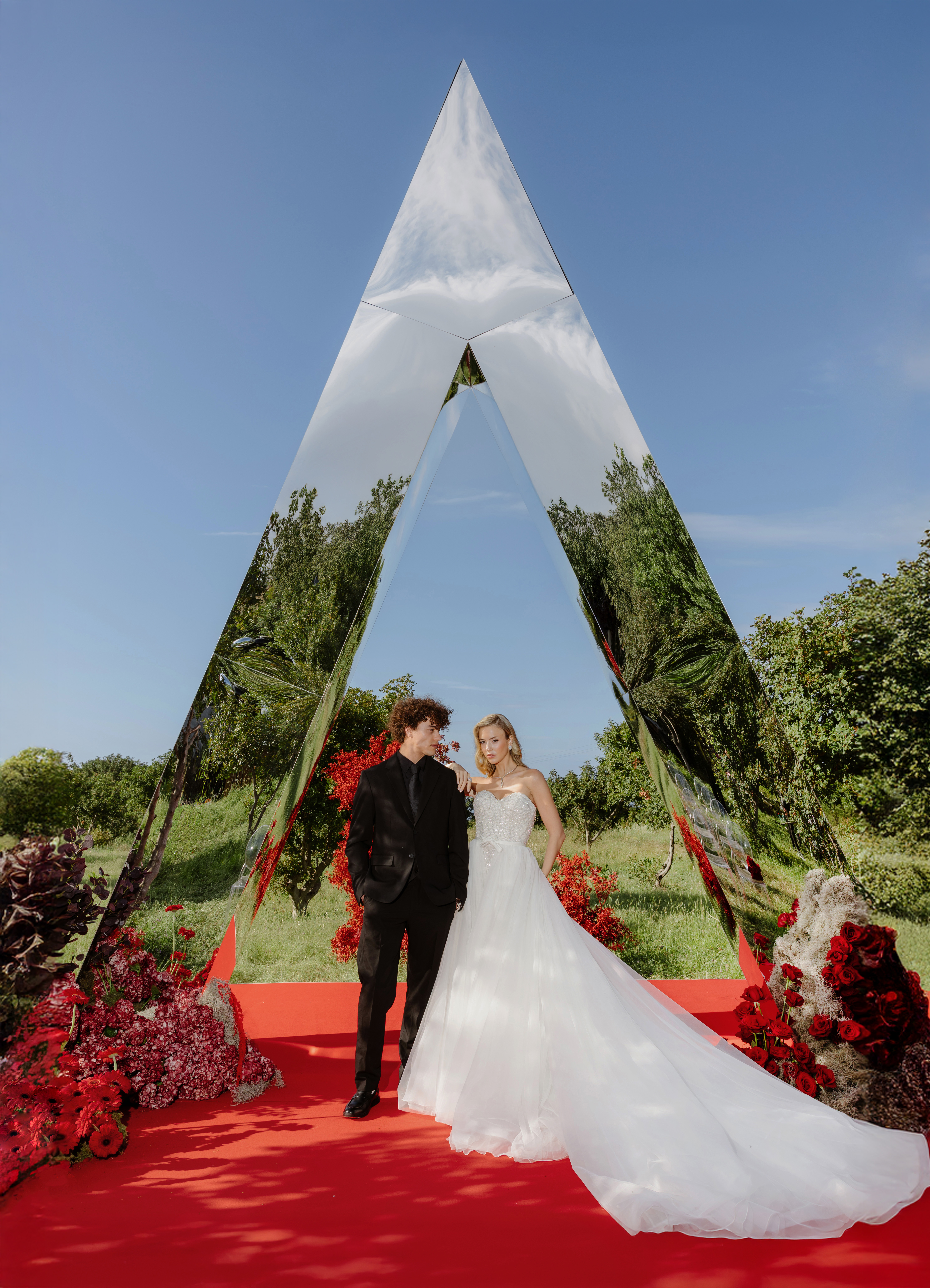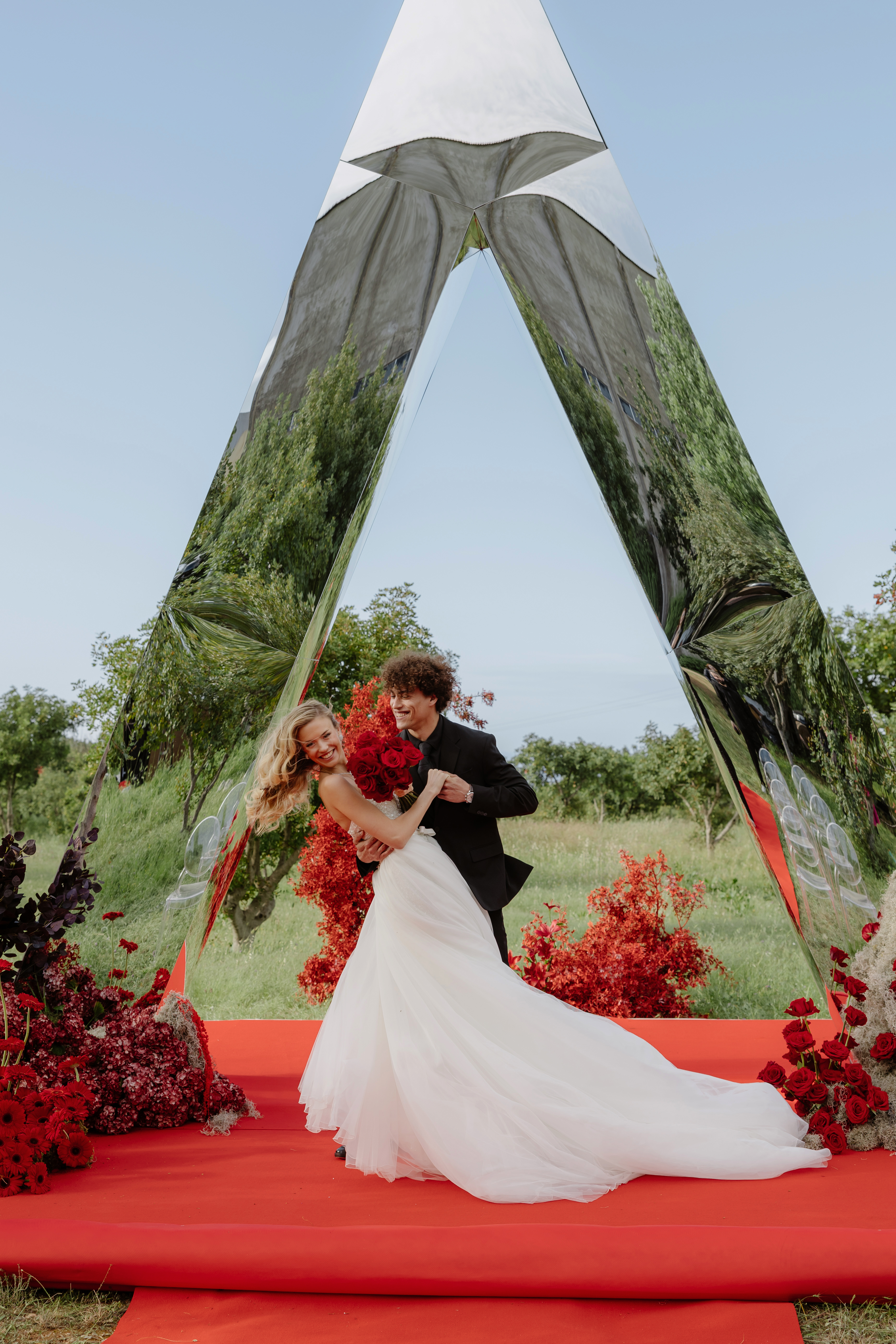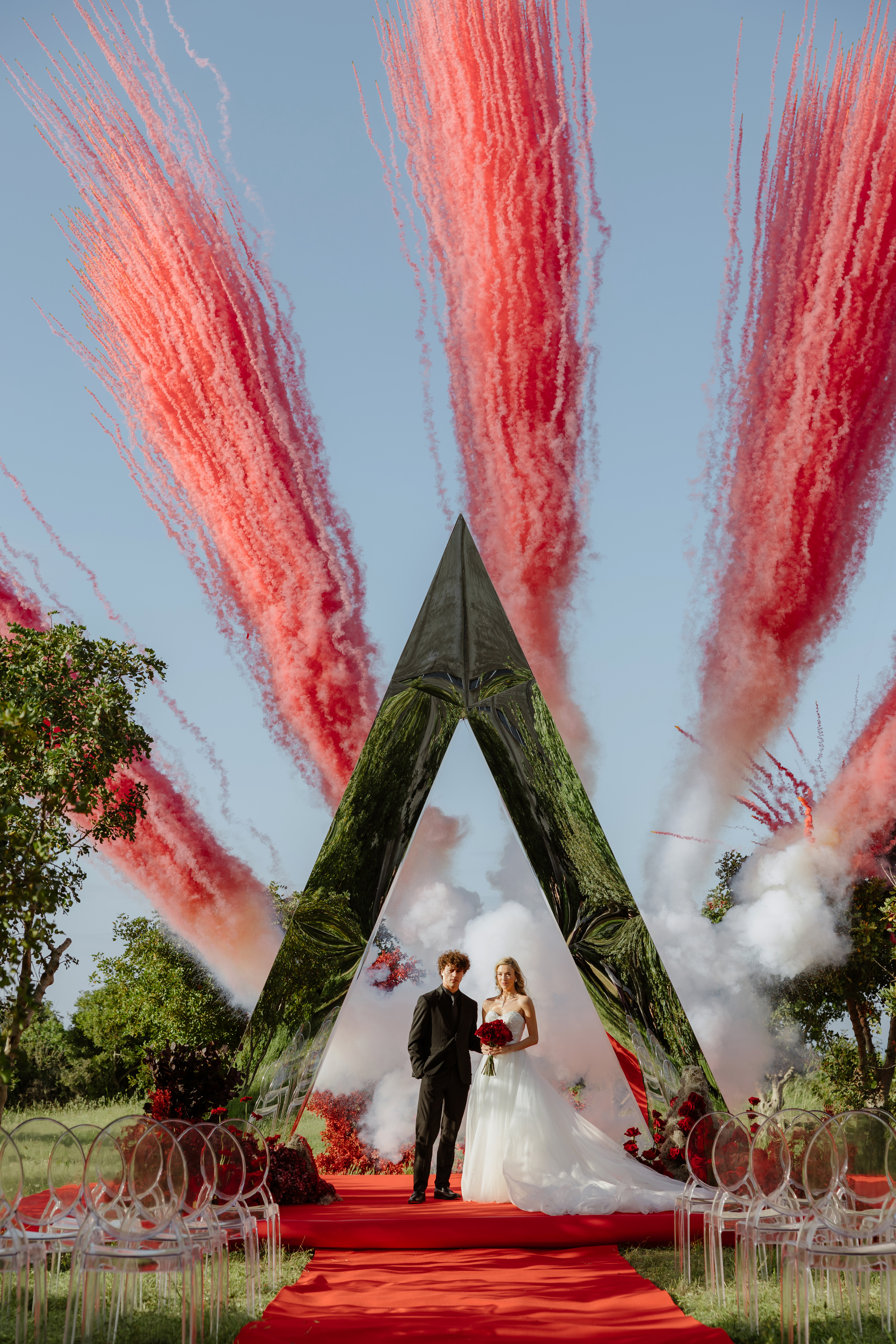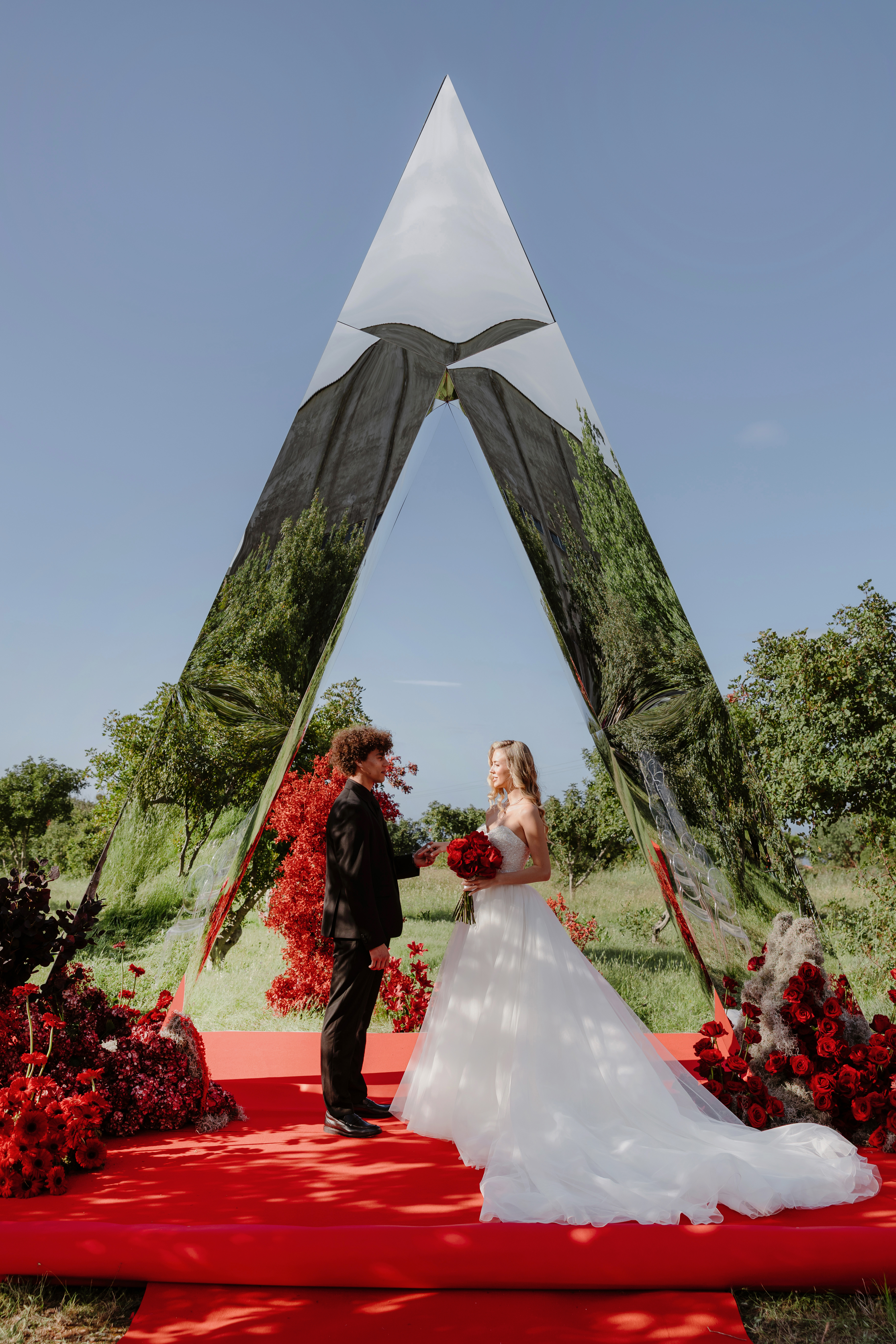 At the heart of this daring scene stands a striking, futuristic arch over 5.6 meters tall - adorned with mirrored panels that bend reality and bold, sculptural red florals that infuse passion into the sleek setting. It doesn't just frame a ceremony - it transforms space and light, creating an atmosphere that is surreal and unforgettable.