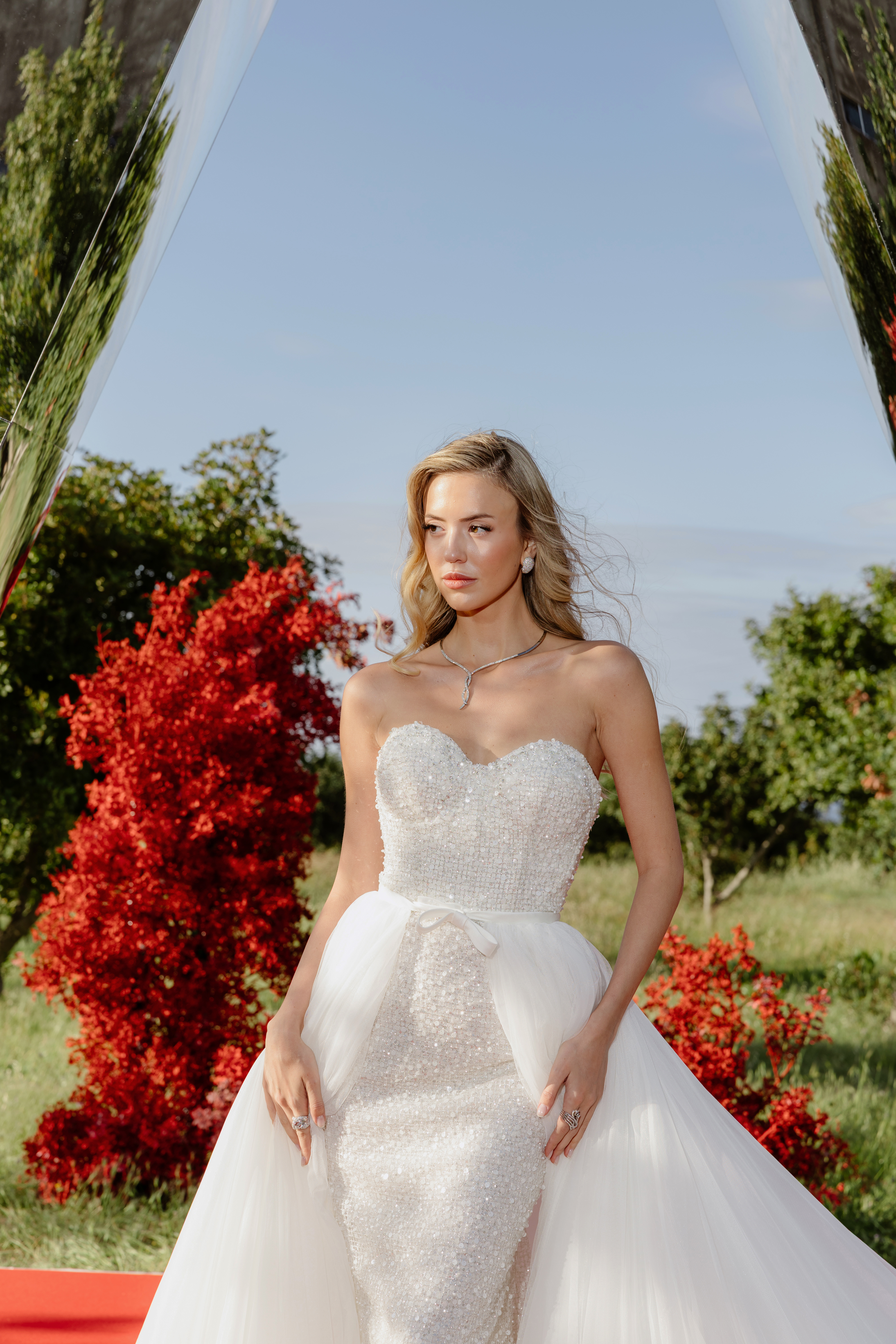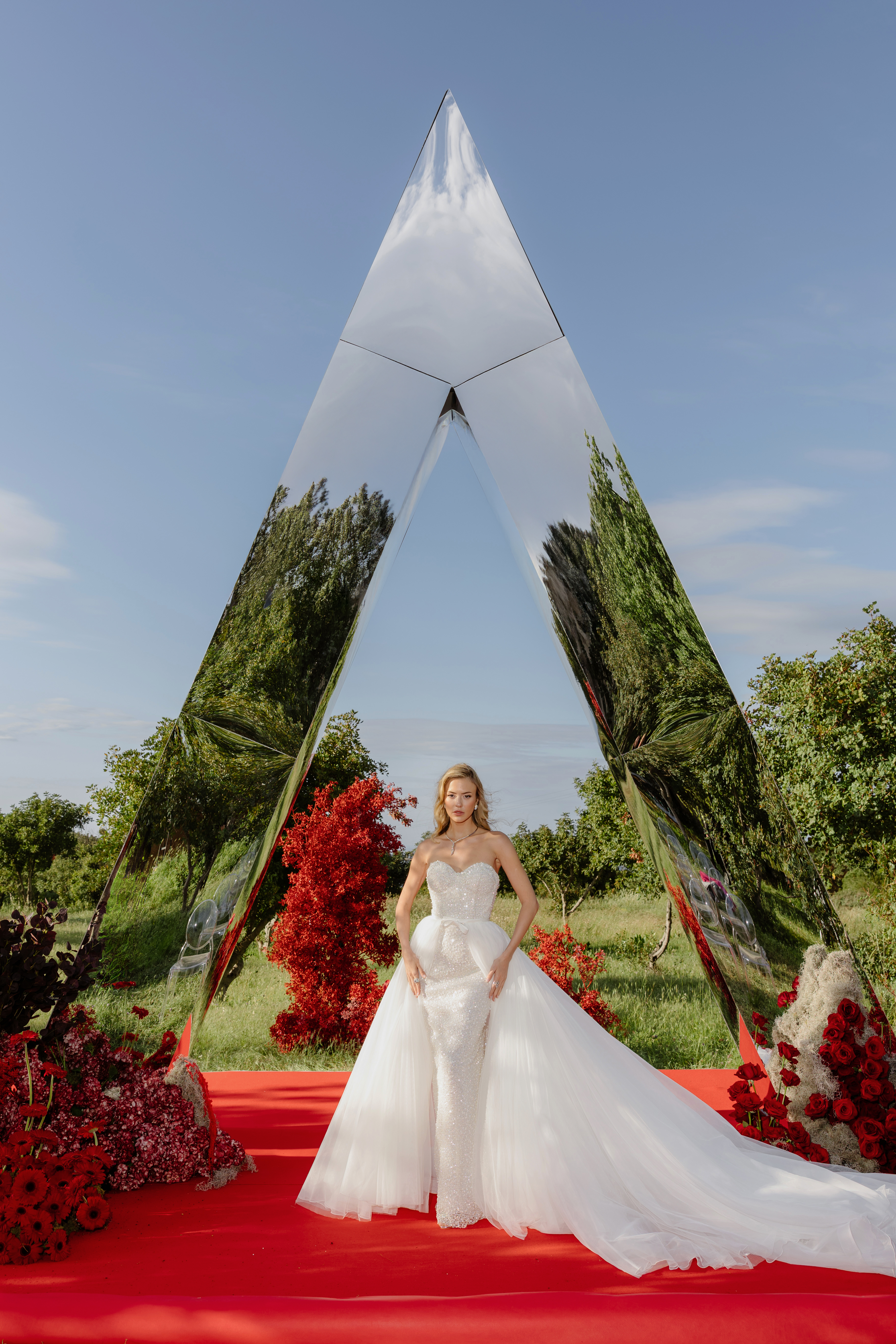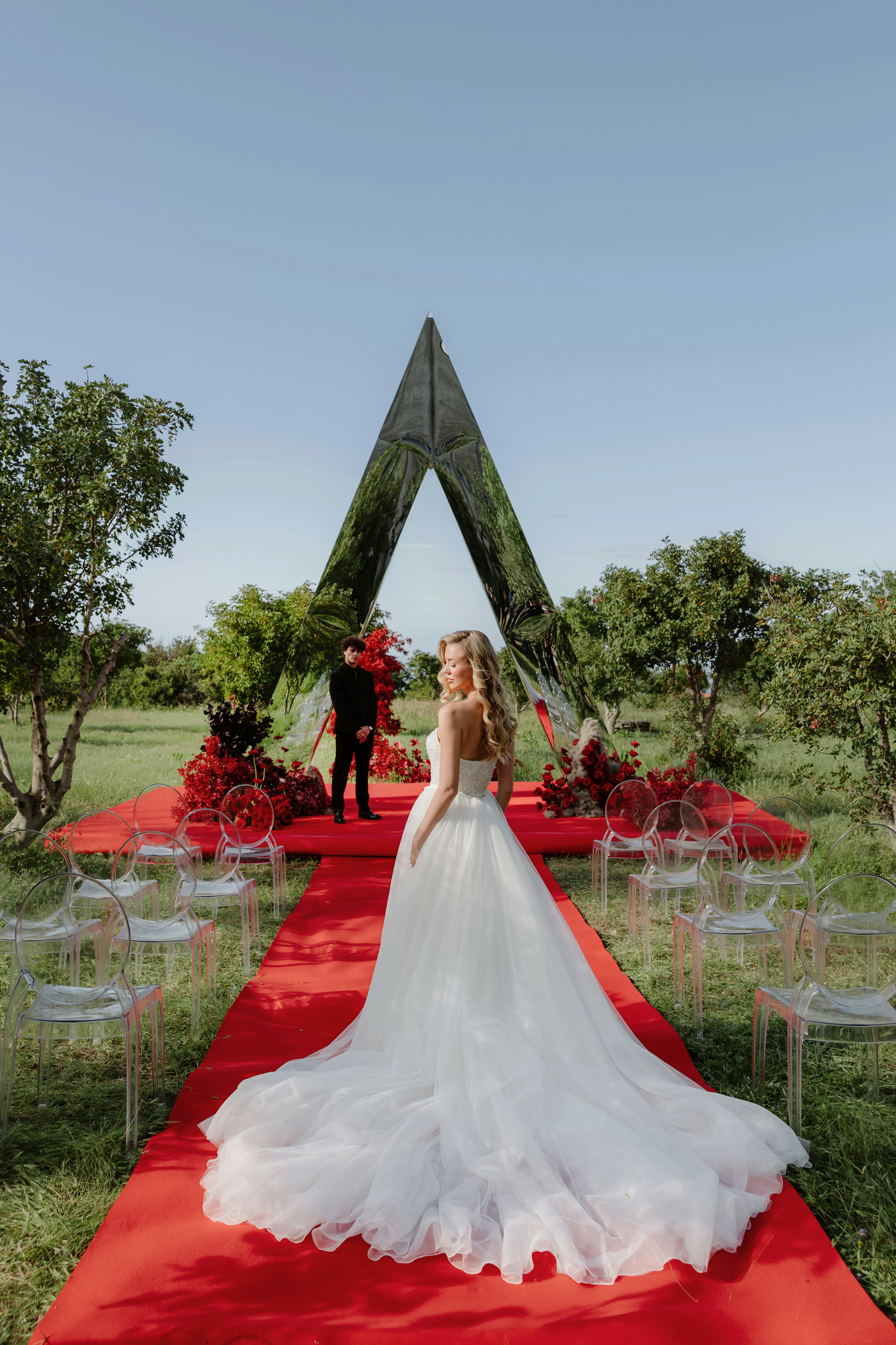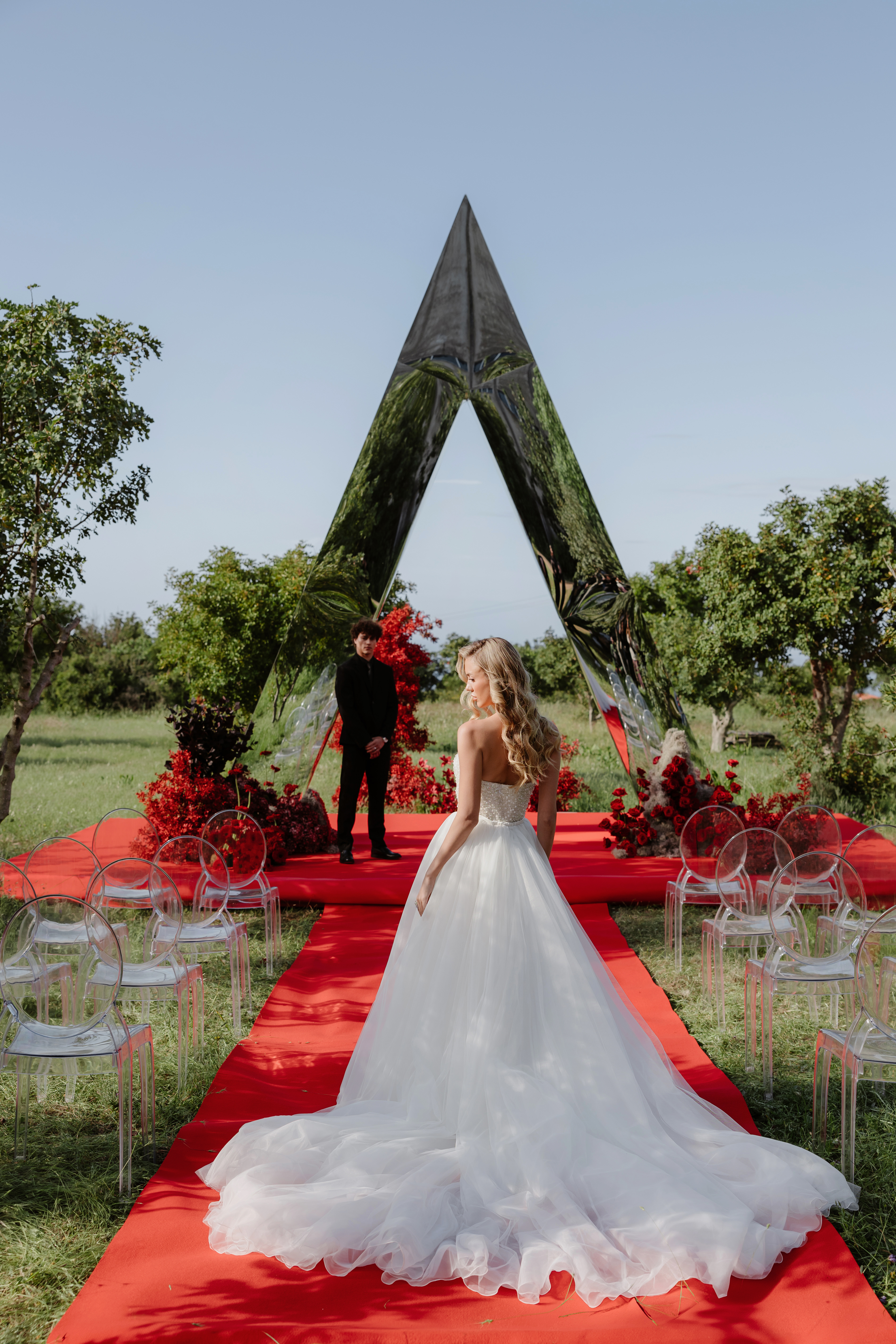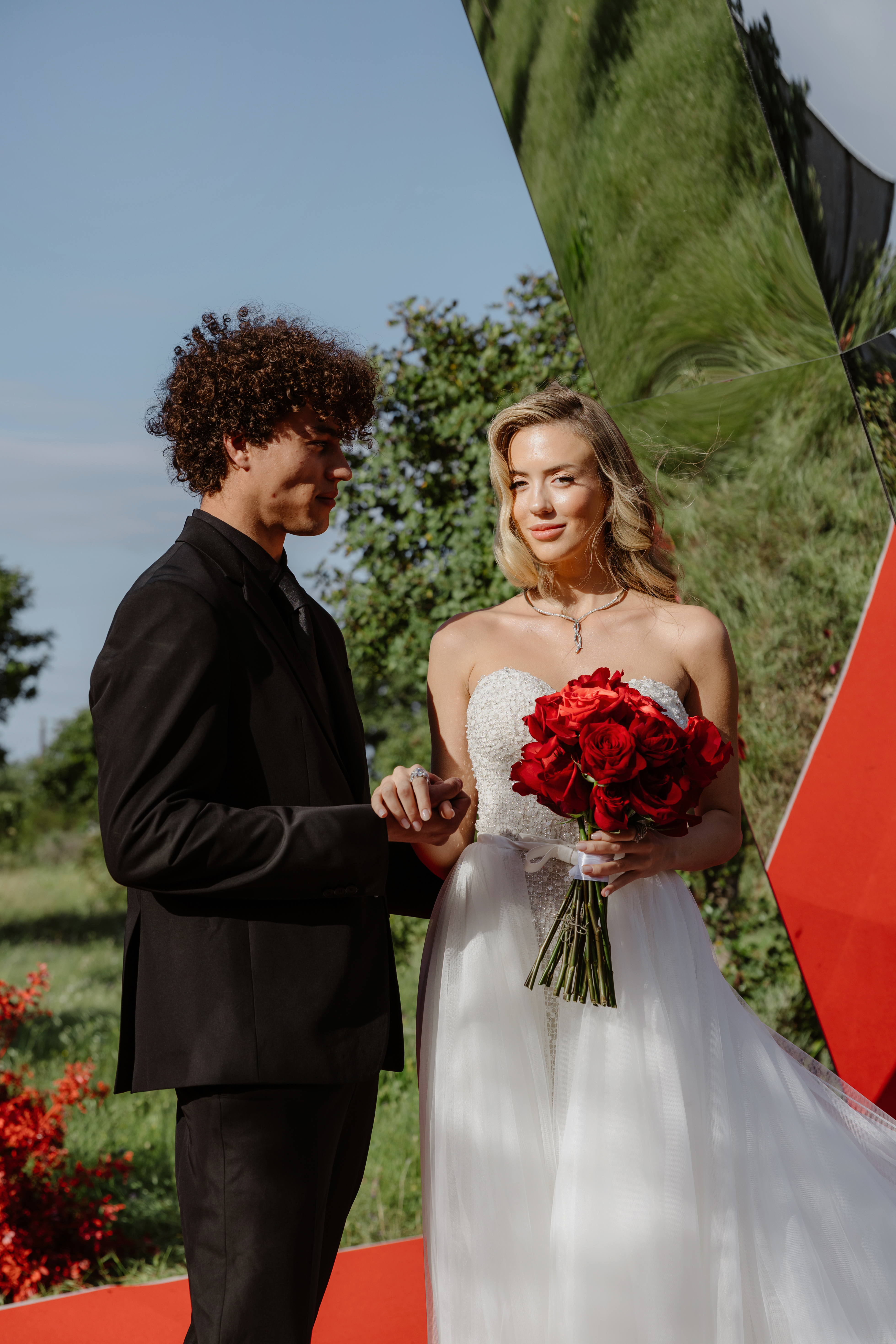 At the heart of this daring scene stands a striking, futuristic arch over 5.6 meters tall - adorned with mirrored panels that bend reality and bold, sculptural red florals that infuse passion into the sleek setting. It doesn't just frame a ceremony - it transforms space and light, creating an atmosphere that is surreal and unforgettable.