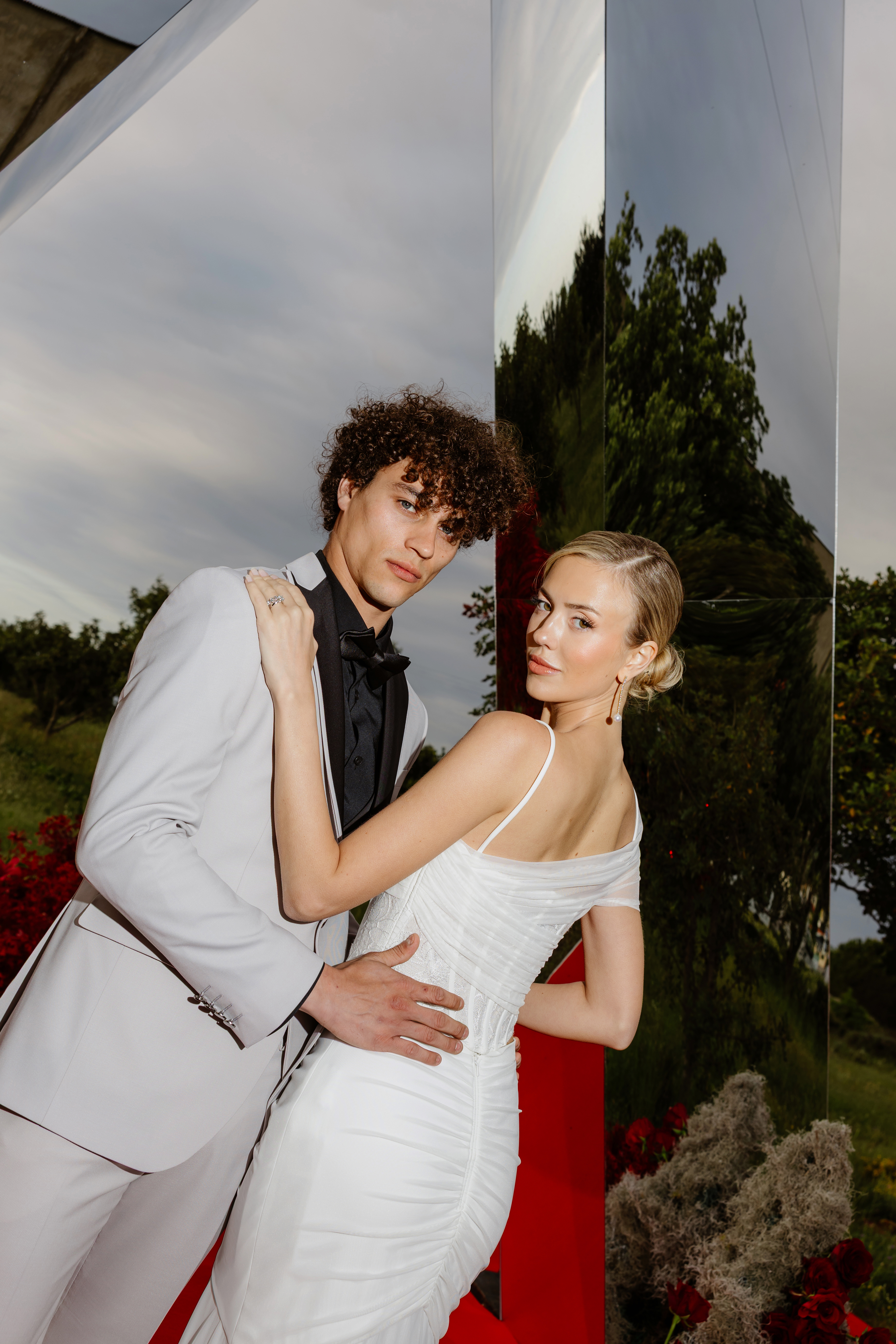 Fashion plays its own bold role in this futuristic tableau. The bride's Prova Bridal gown drapes fluidly beneath the towering mirror arch, its silhouette offering movement and grace that contrasts beautifully with the architectural precision surrounding it. The fabric catches light like water, creating its own reflections within the already mirror-filled space.