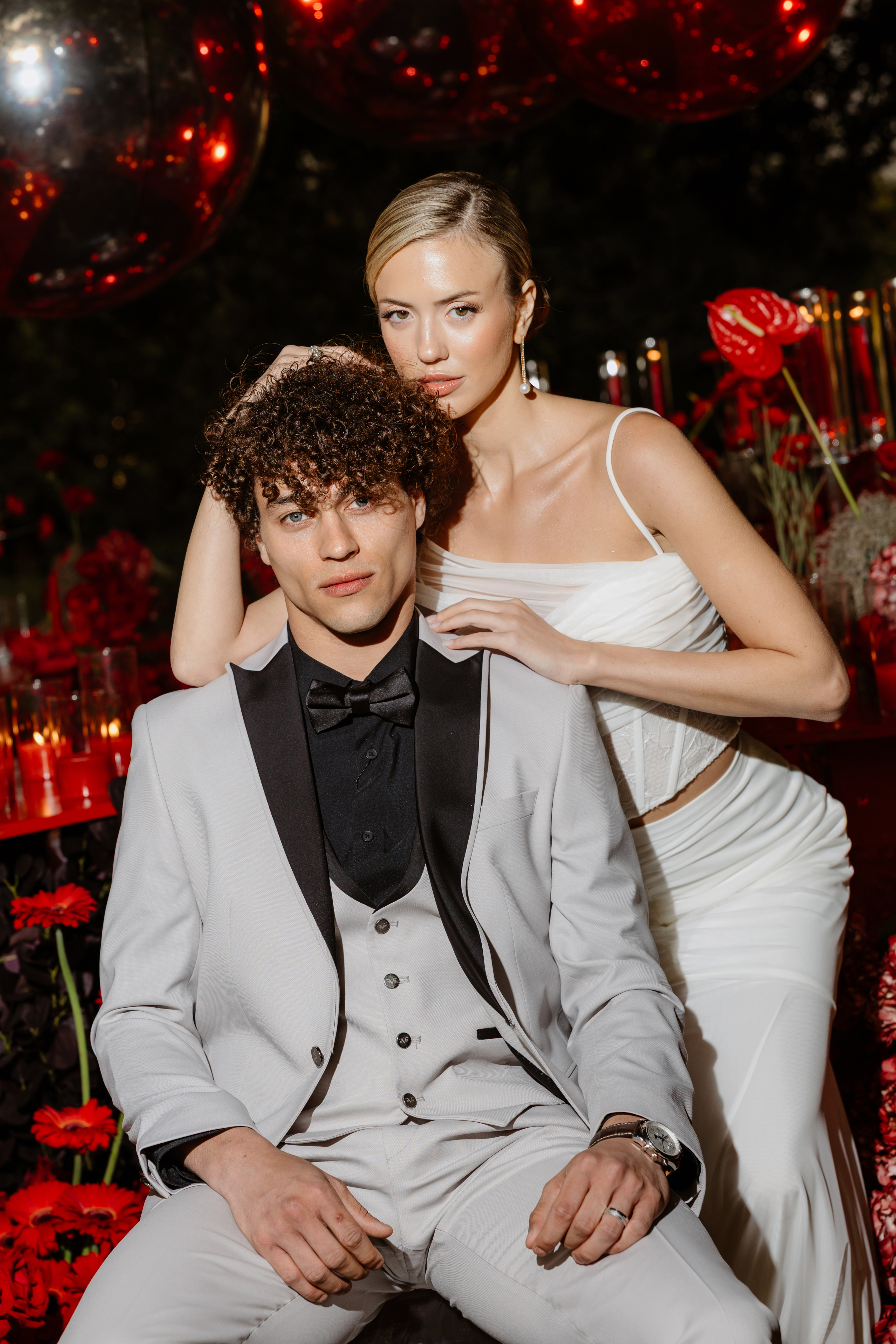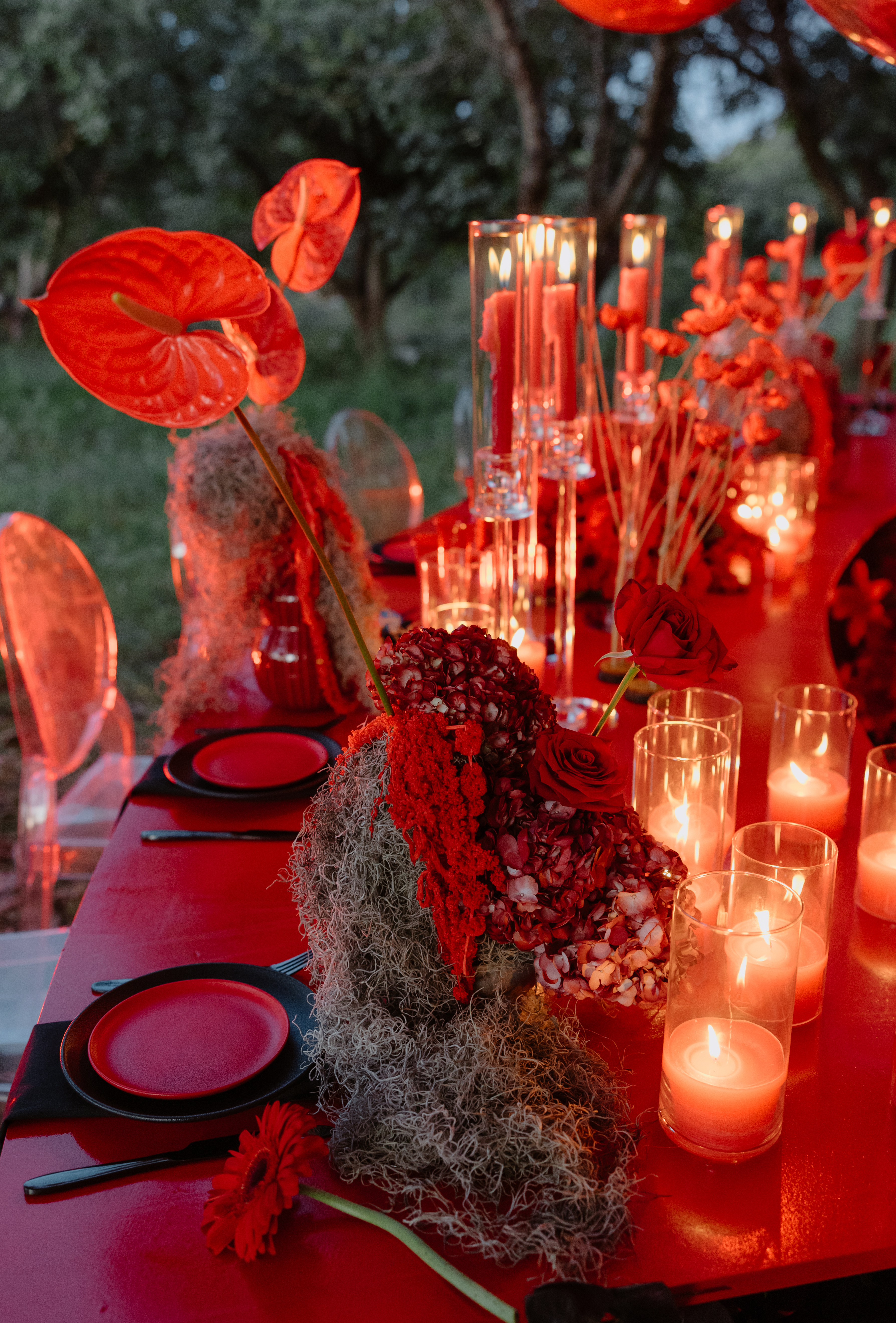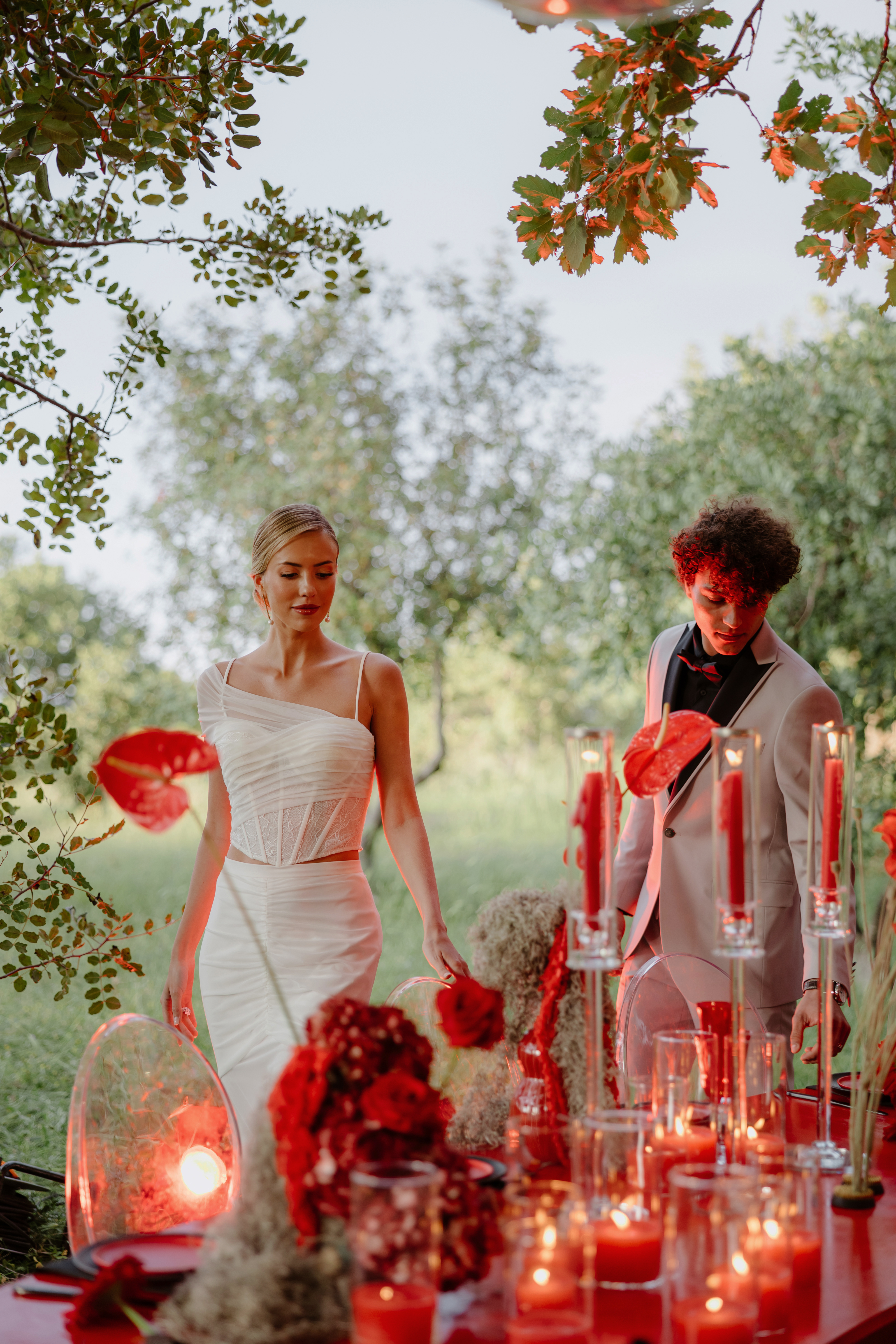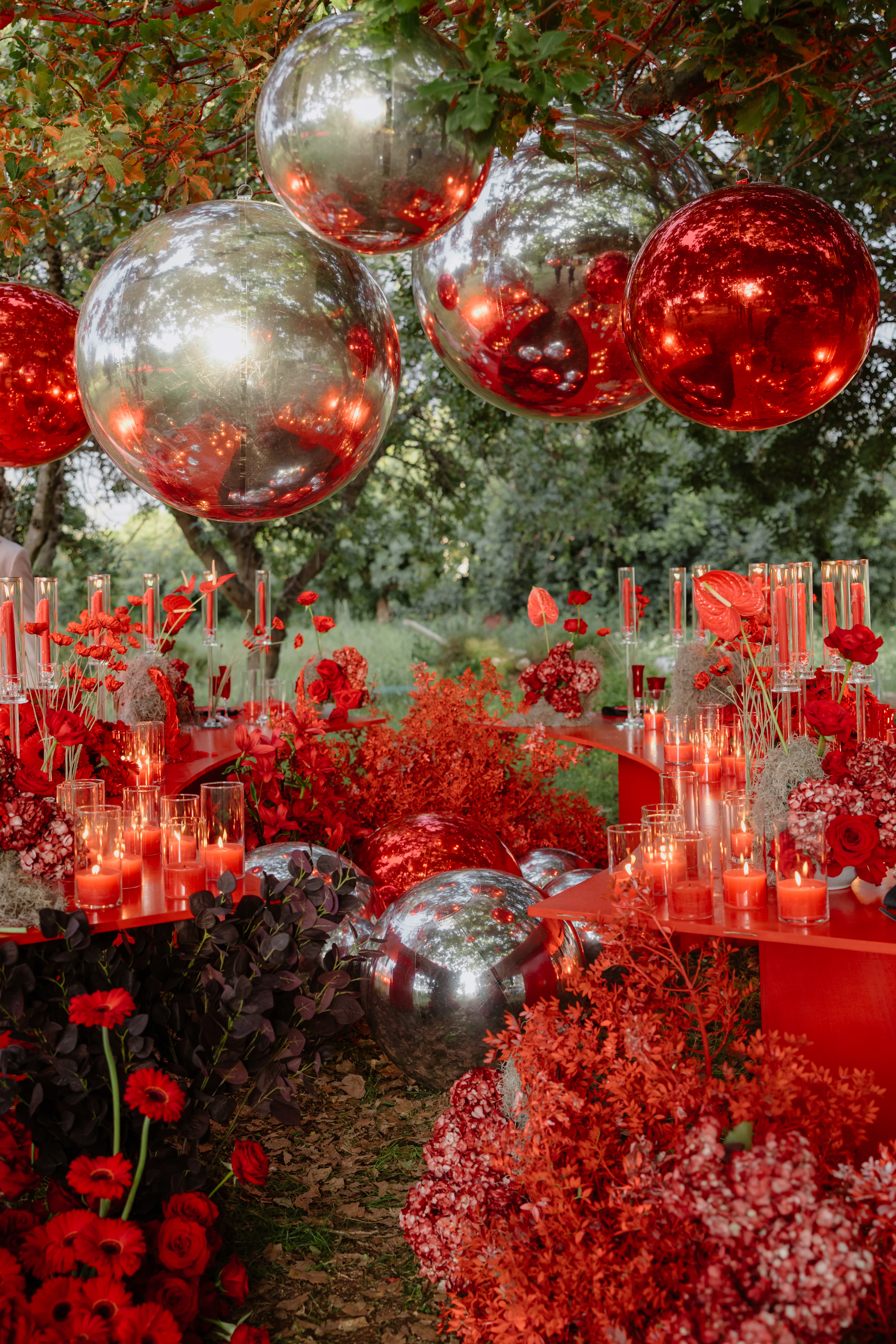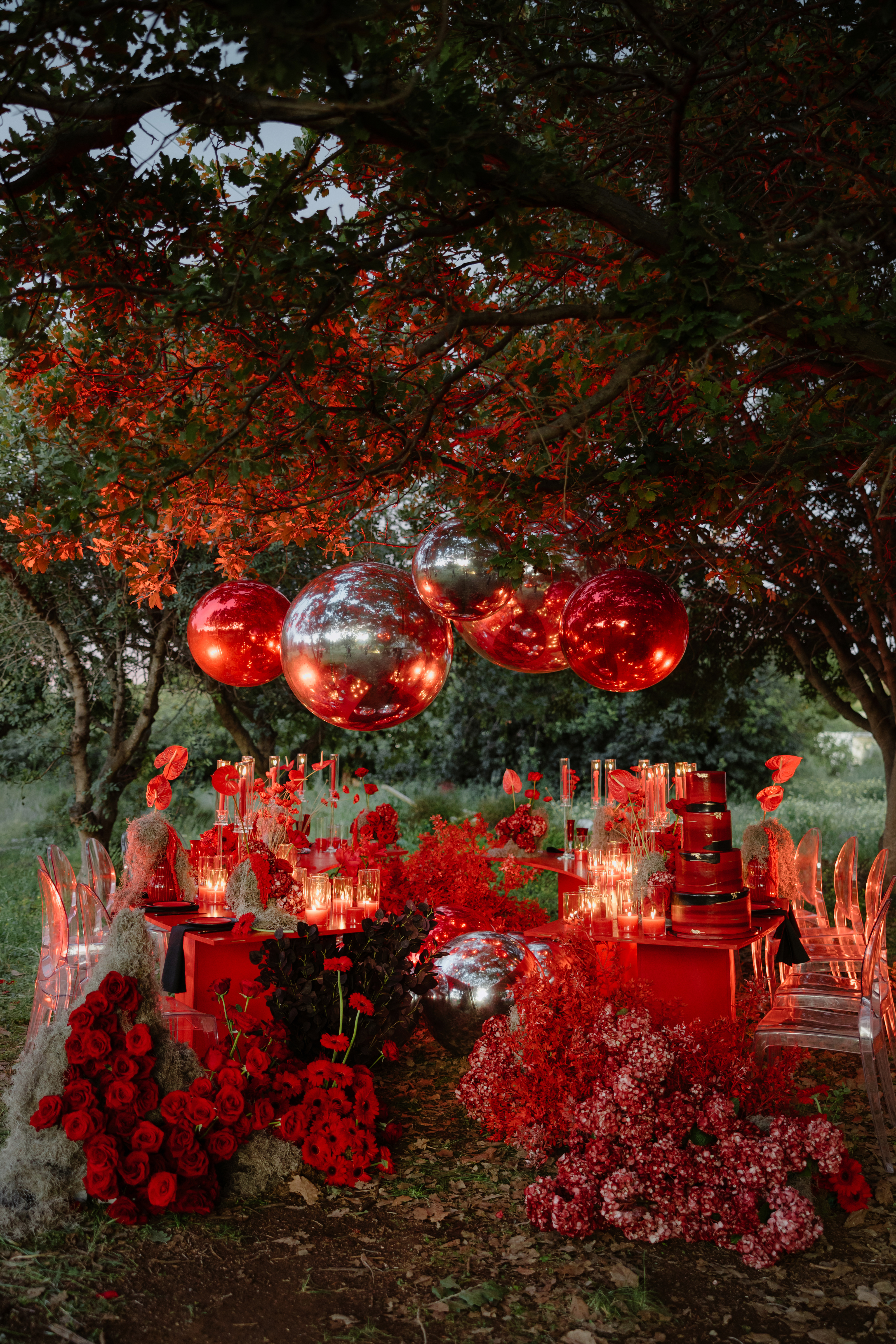 Crimson blooms spill like liquid fire across glossy surfaces, while sculptural furniture adds layers of intrigue and modernity. This striking dance of reflection and color is no accident - Eventous Weddings by Anna orchestrated every element to challenge convention while keeping the mood irresistibly romantic.