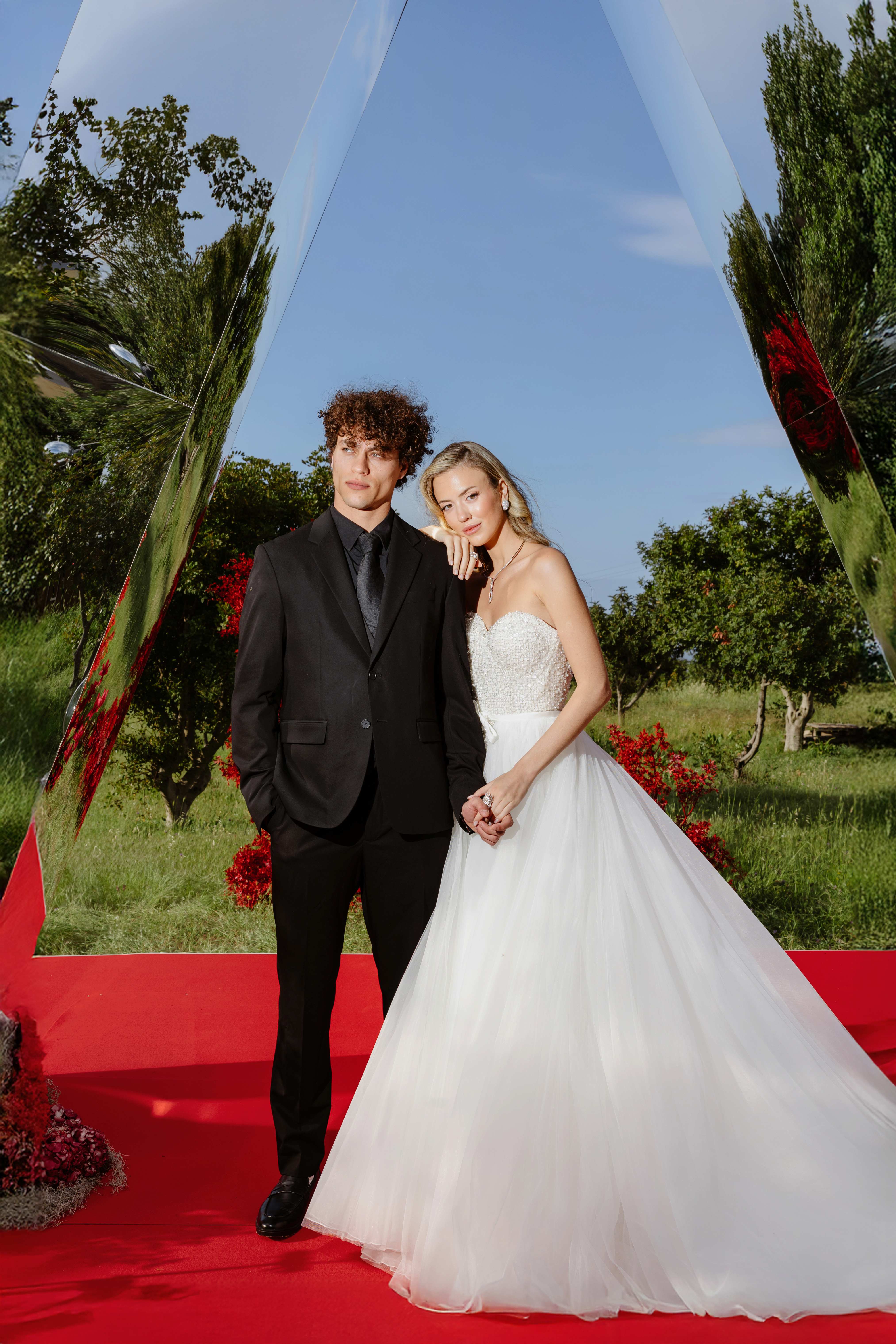 Meanwhile, the groom's Paolo Moreno Italy attire brings classic tailoring into the future with impeccable cuts and contemporary detailing. Together, they embody the editorial's core philosophy: respect the foundations of tradition while boldly stepping into new territory.
