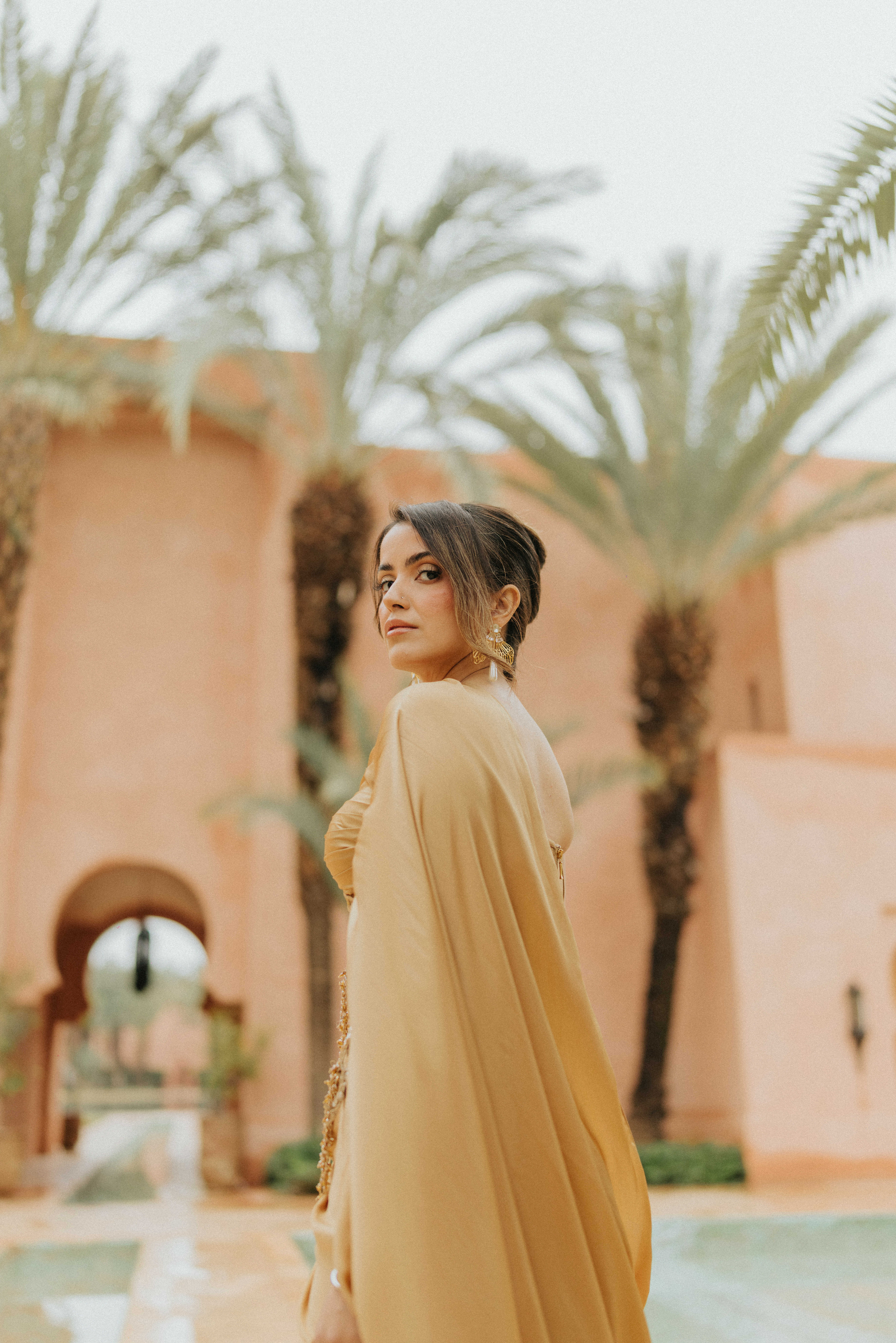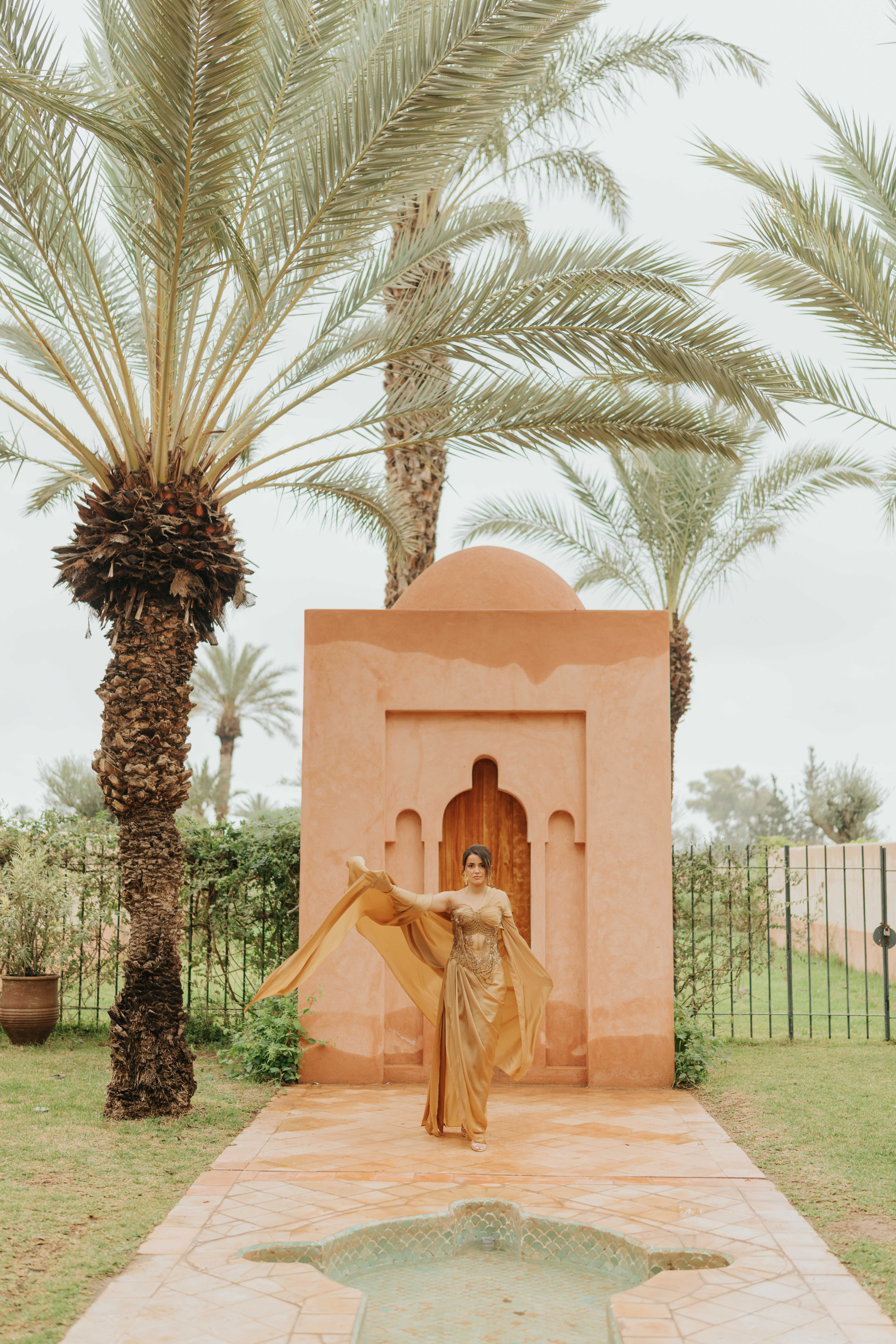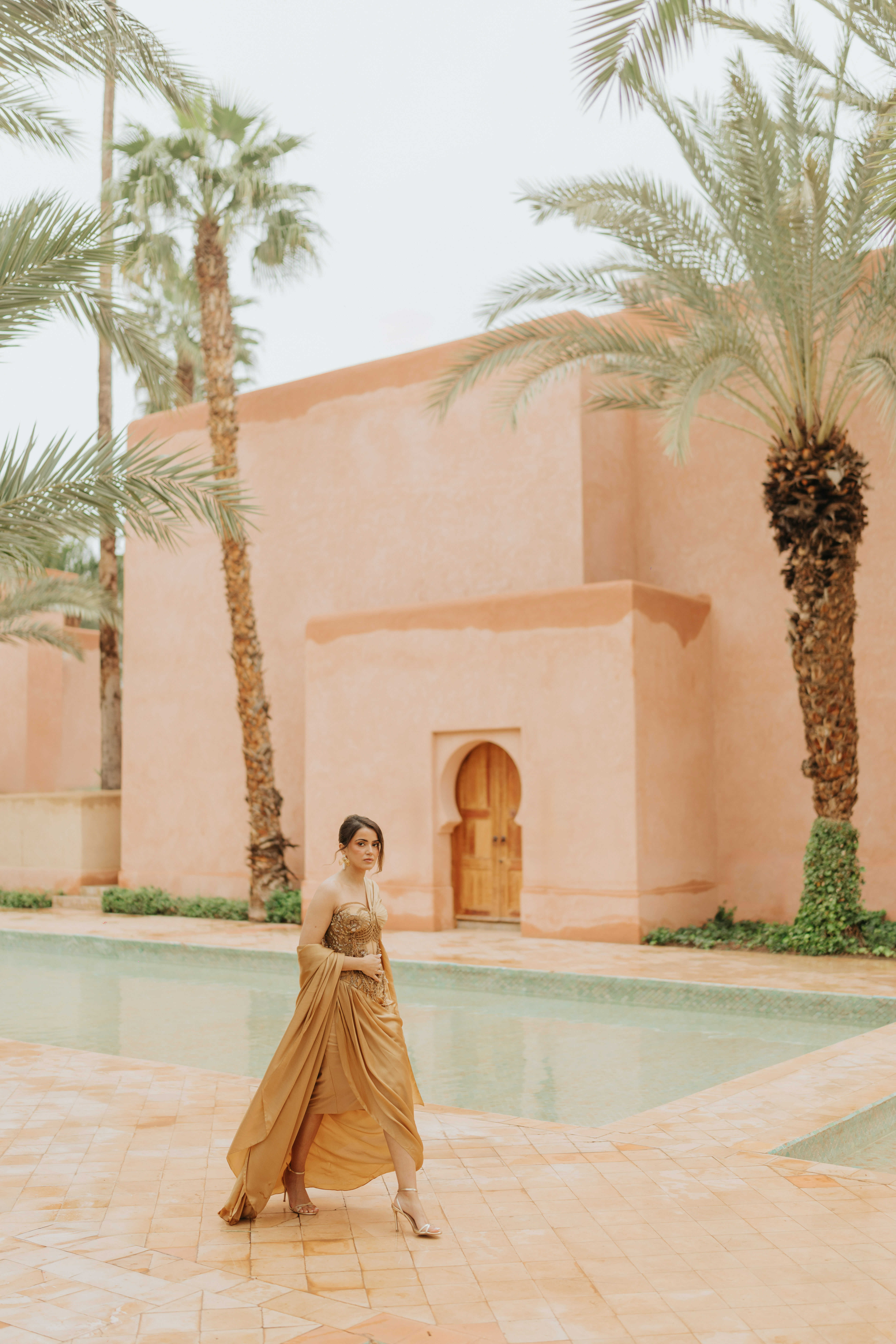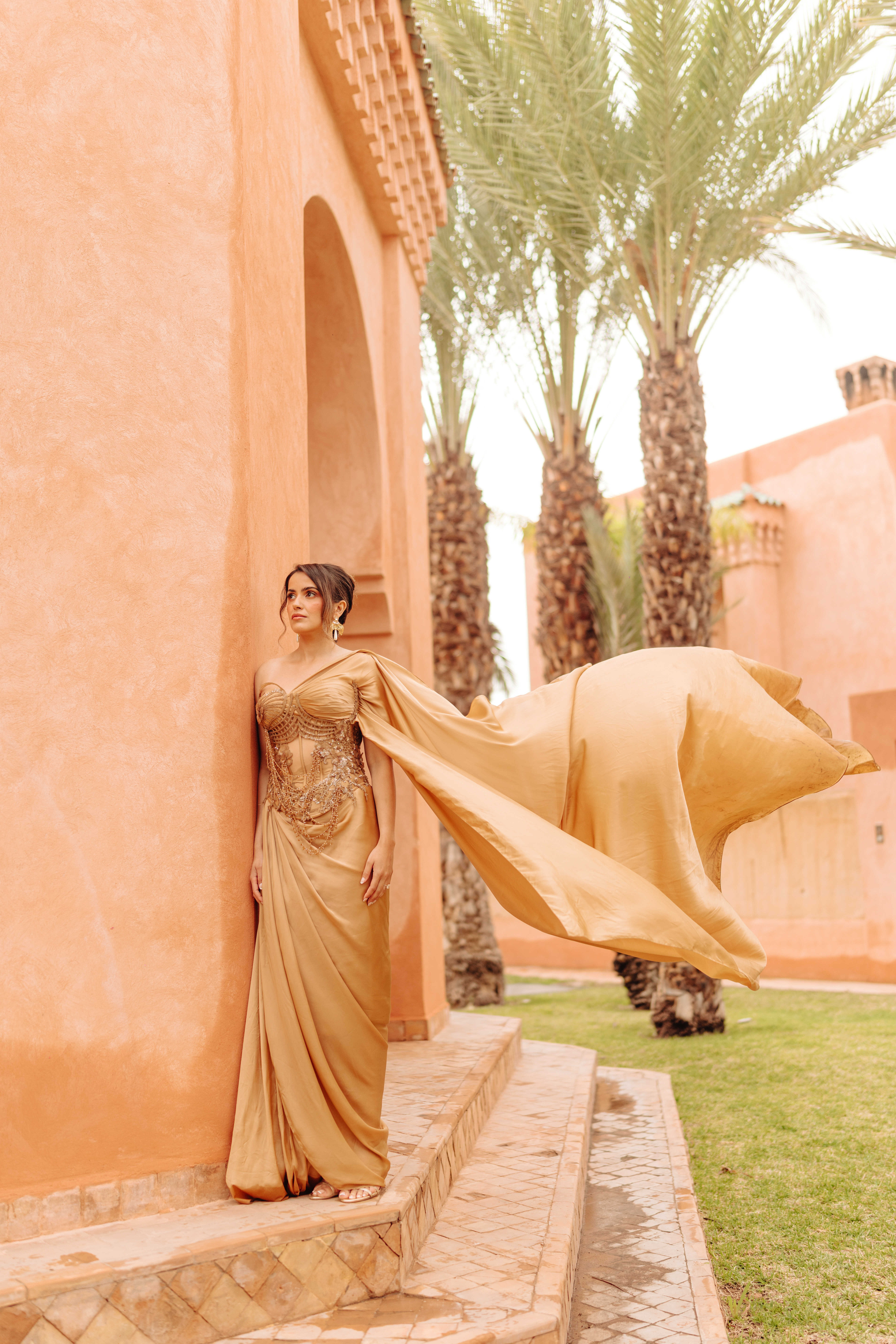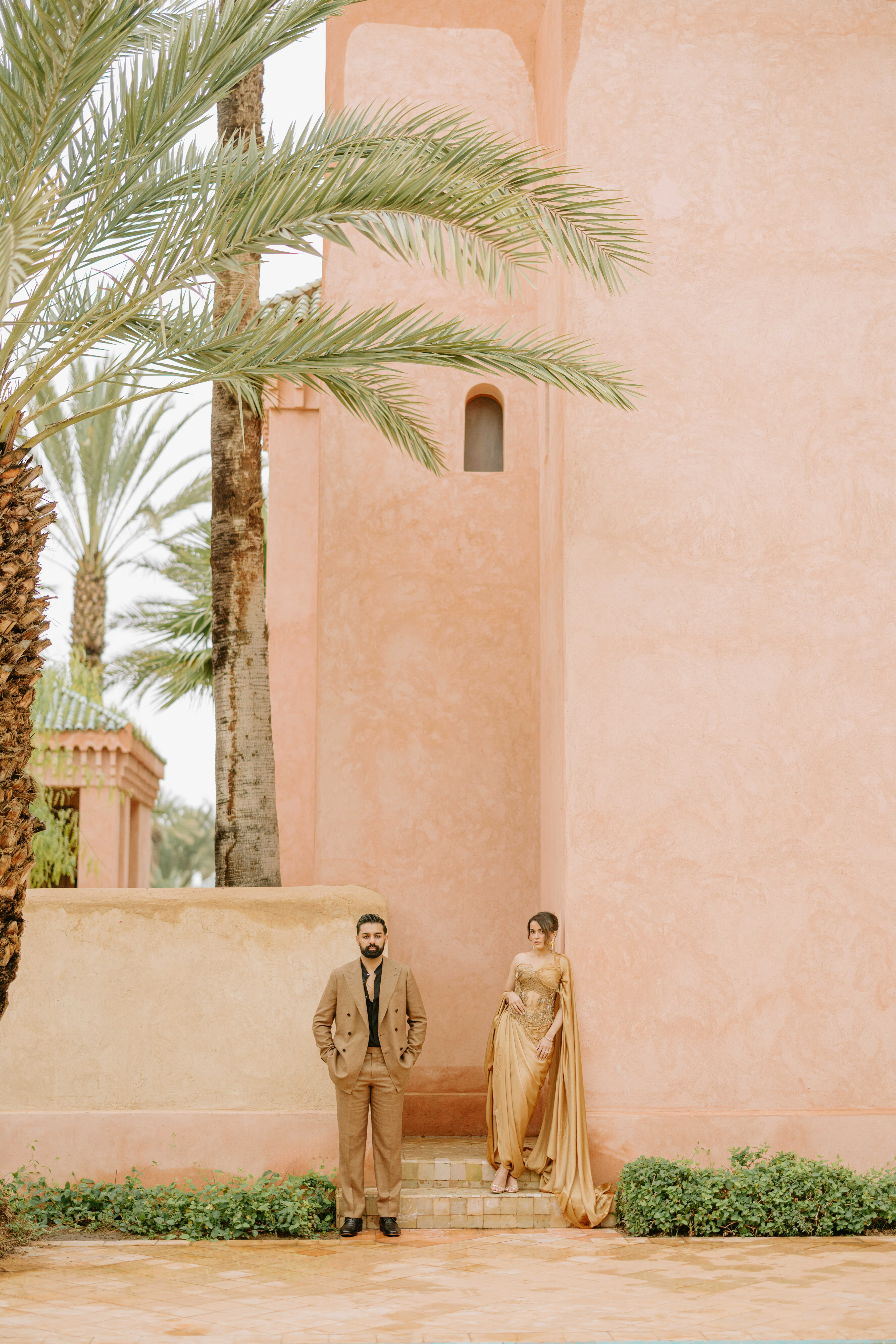 Stylist Kamal Sidhu flew in from California with one clear priority: clothing that complemented both the couple and the location rather than competed with it. For Amy, that meant stepping out of her scrubs and into a flowing, gold-toned look that moved with her and held the Moroccan warmth well — feminine and bold, with the strength and presence she carries naturally.