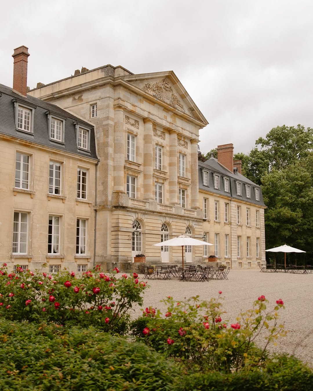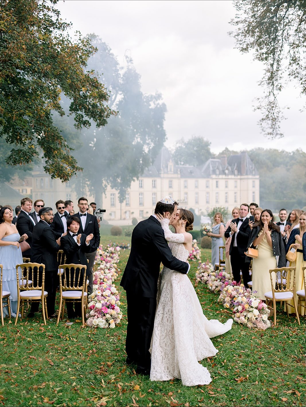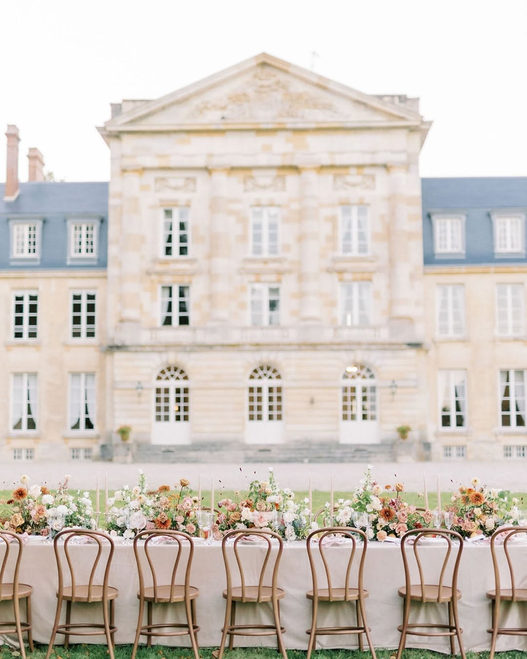 The Château d’Aveny sits perfectly between country charm and elegance. The building is balanced, the lawns are neatly trimmed and stretch to the edge of the forest, and you have complete privacy, even though it is less than two hours from Paris. This makes your wedding feel like it is happening on your own country estate, even if you are only there for the weekend. Ceremonies happen on grass so neatly cut that it looks like velvet in photos, while receptions are held at long tables in the courtyard, surrounded by stone walls covered in climbing vines and soft lighting that makes everything look romantic.