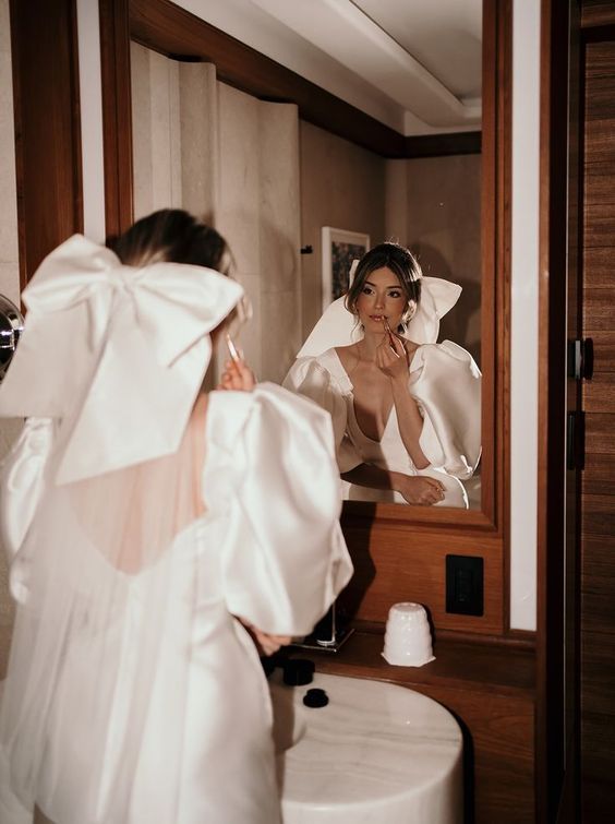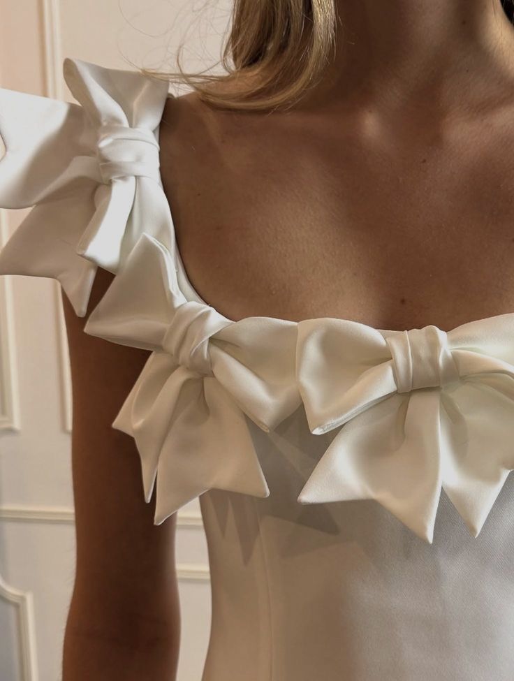 Shorter veils with bows feel sweet and vintage-inspired. A shoulder-length or elbow-length veil with a generous bow creates that playful coquette energy without the formality of a cathedral length. These are particularly gorgeous with tea-length or midi dresses, keeping proportions balanced.