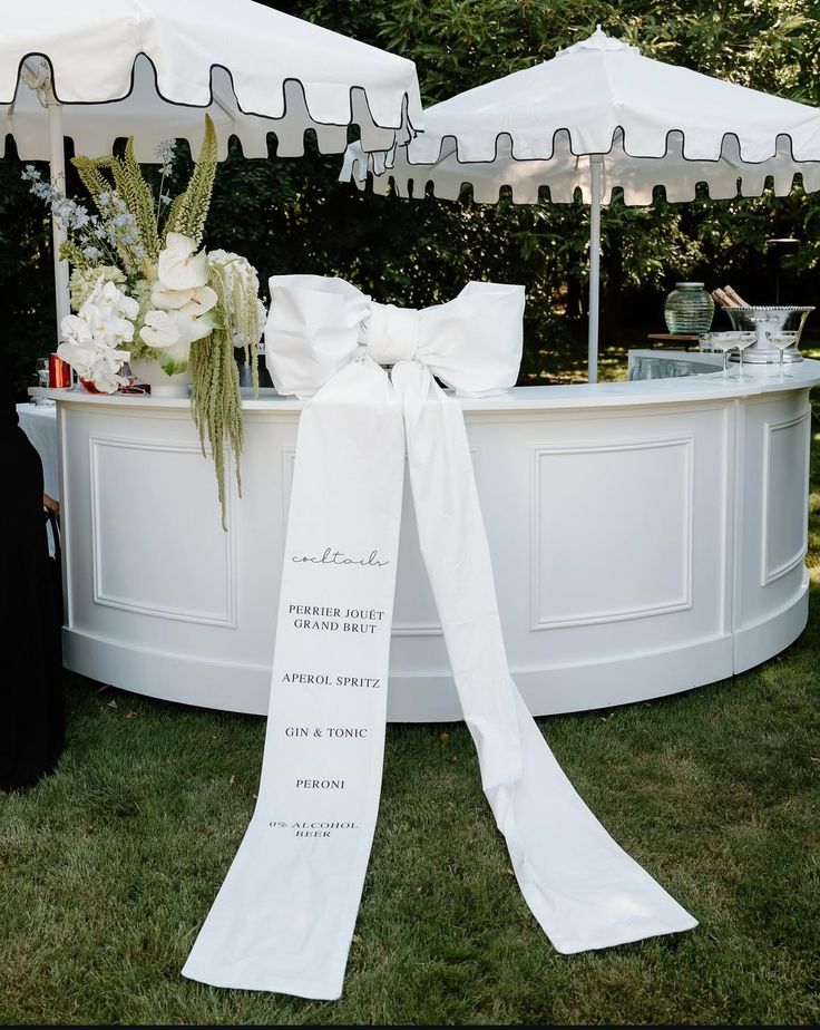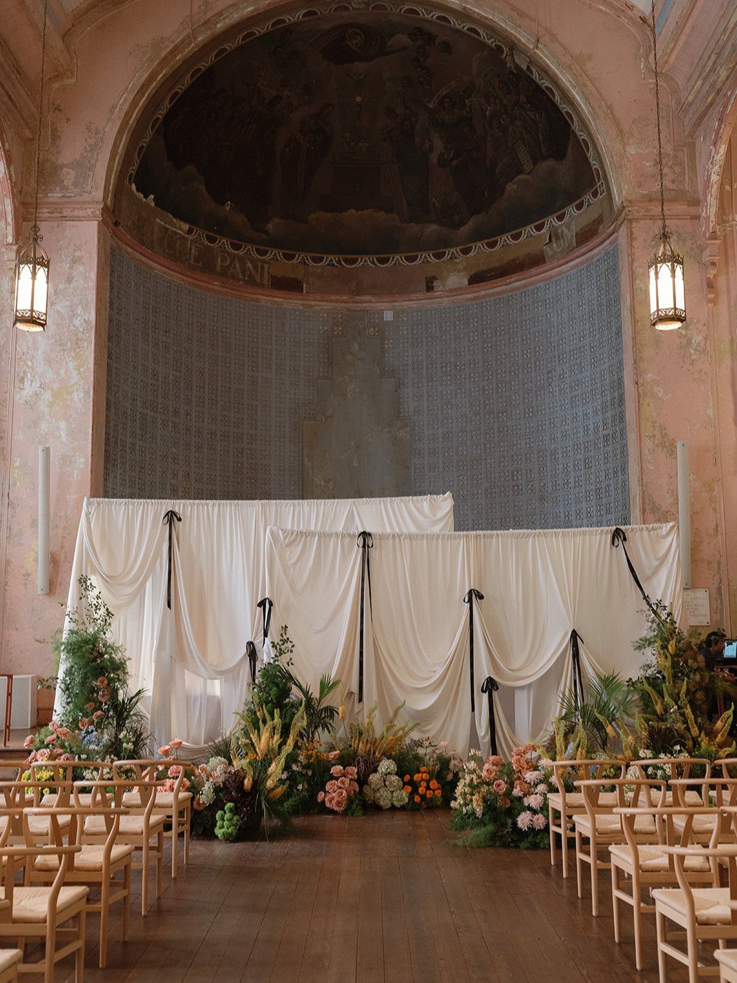 Ceremony arches are having their main character moment in coquette weddings. Forget minimal greenery on a wooden frame—we're talking sheer fabric gathered and draped (never pulled tight), with florals cascading asymmetrically down one side. The fabric needs to move, to catch the breeze, to feel alive. Secure everything with oversized satin bows because subtlety isn't the goal here.