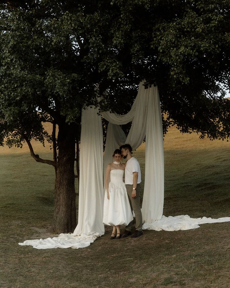 Fabric choice matters more than you might think. Silk satin creates that luxe, expensive look and photographs like butter, but it's unforgiving of every lump and bump. Mikado offers structure with a subtle sheen that's more forgiving. Tulle and organza bring that ethereal, floaty quality essential to the aesthetic. Many brides are mixing fabrics—a structured satin bodice with a soft tulle skirt, or organza sleeves with a crepe body—to get the best of all worlds.