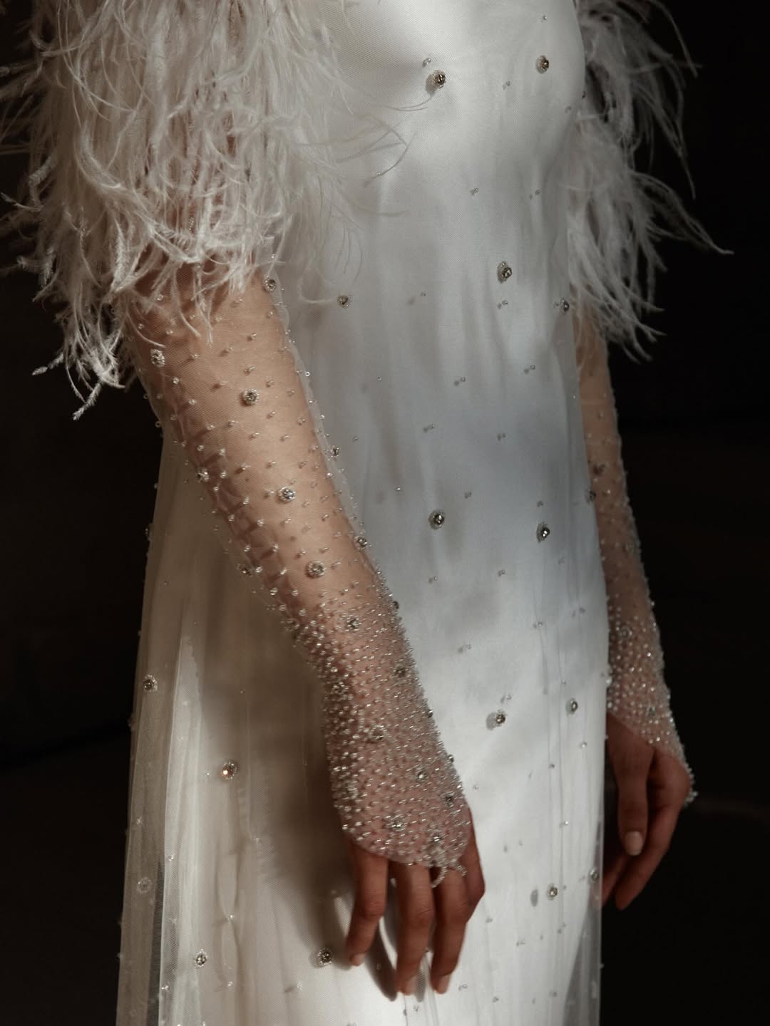 Feathered bridal gloves are the ultimate statement of ethereal luxury. Delicate marabou trim at the wrist, ostrich feather accents along the arm, or full feathered cuffs create movement and texture that fabric alone cannot achieve. These gloves feel both vintage-inspired and thoroughly modern — reminiscent of 1920s glamour but executed with contemporary sensibility. They photograph beautifully, adding softness and dimension to every image. Feathered gloves work especially well with minimalist gowns, providing drama without competing with ornate dress details.