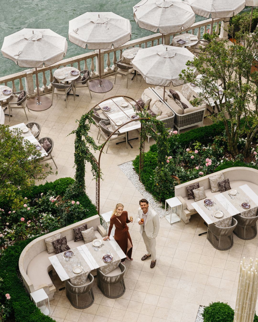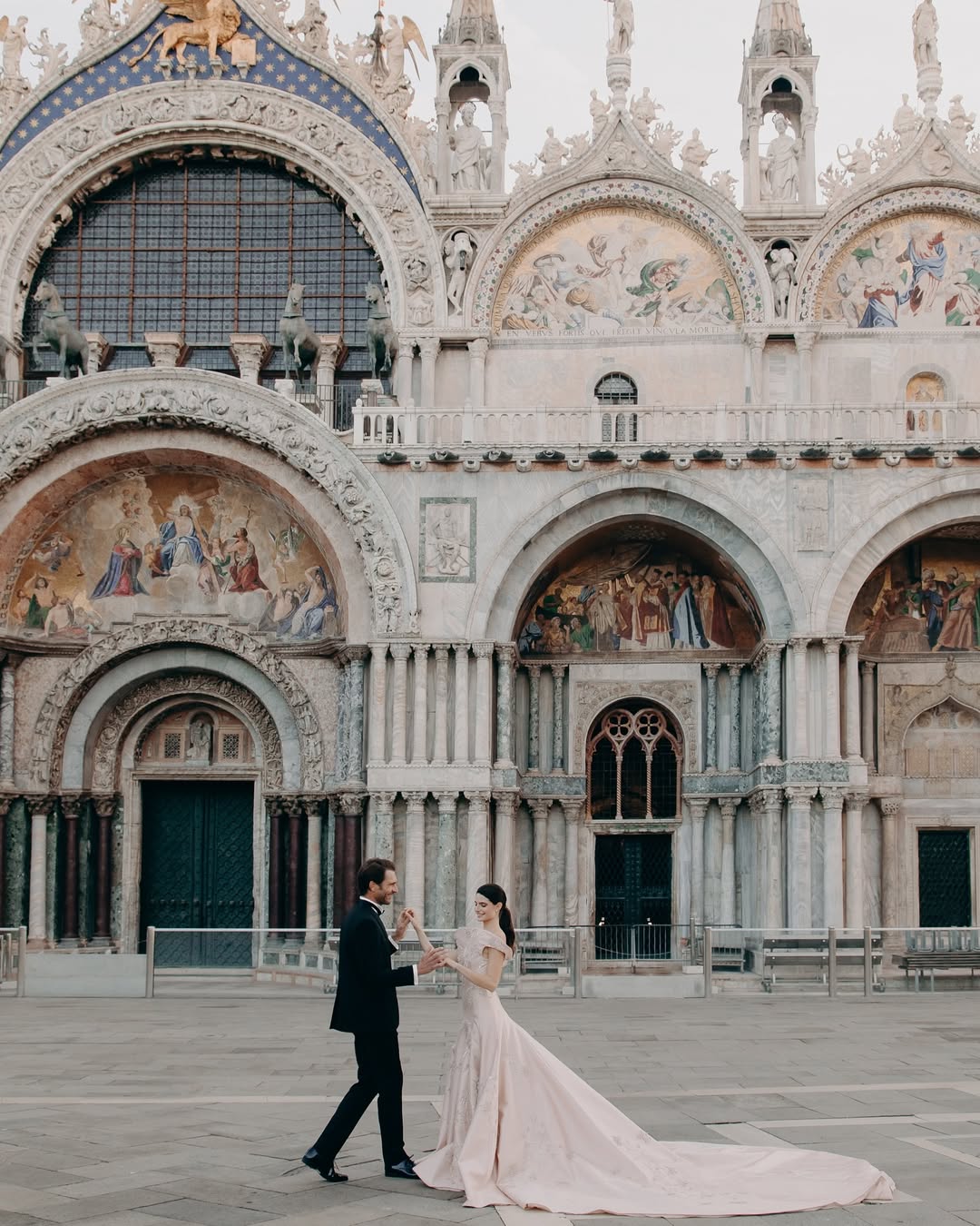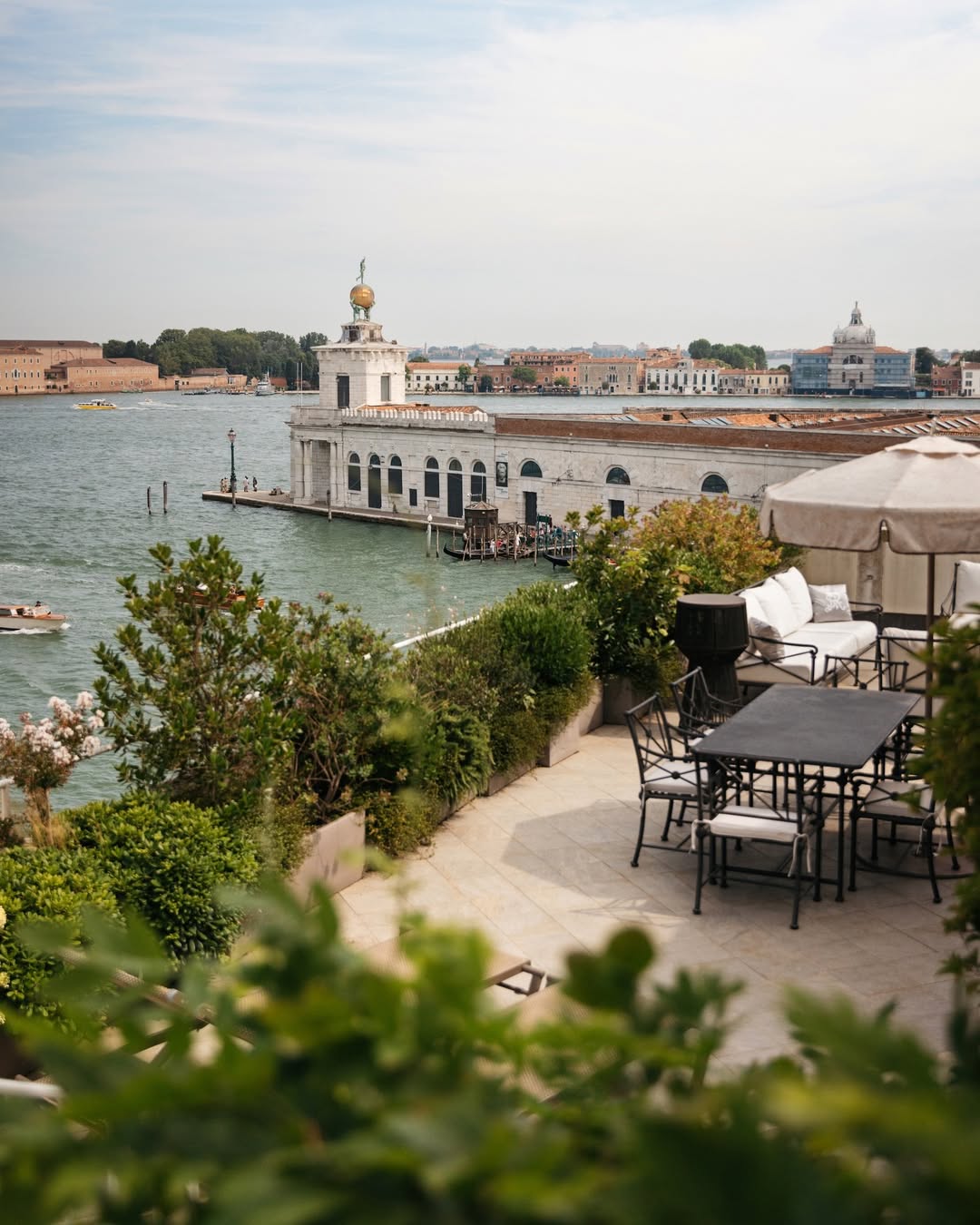 At Hotel Danieli, the terrace doesn’t just offer a view — it offers the entire lagoon in one frame. The panorama stretches from San Marco to San Giorgio Maggiore, bathing your photos in a golden halo at sunset. The color palette here is what makes it special: the soft blue of the lagoon, the coral tones of the sky, and the warm marble of the terrace blend perfectly with white gowns and champagne tones.