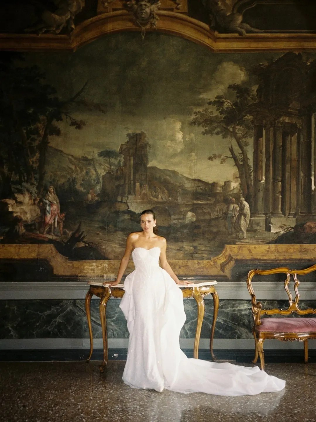 For couples who want a softer, romantic countryside aesthetic, Villa Valmarana offers a setting that feels straight out of an Italian painting. It’s one of the top Venice wedding locations for those who dream of timeless garden portraits with a hint of aristocratic charm. Surrounded by manicured gardens and marble statues, it provides endless compositions full of depth and serenity. The interiors feature Tiepolo’s frescoes — pastel scenes that look incredible behind a bridal portrait. But the best shots happen outdoors, where tree-lined paths lead toward open views of the Venetian sky.