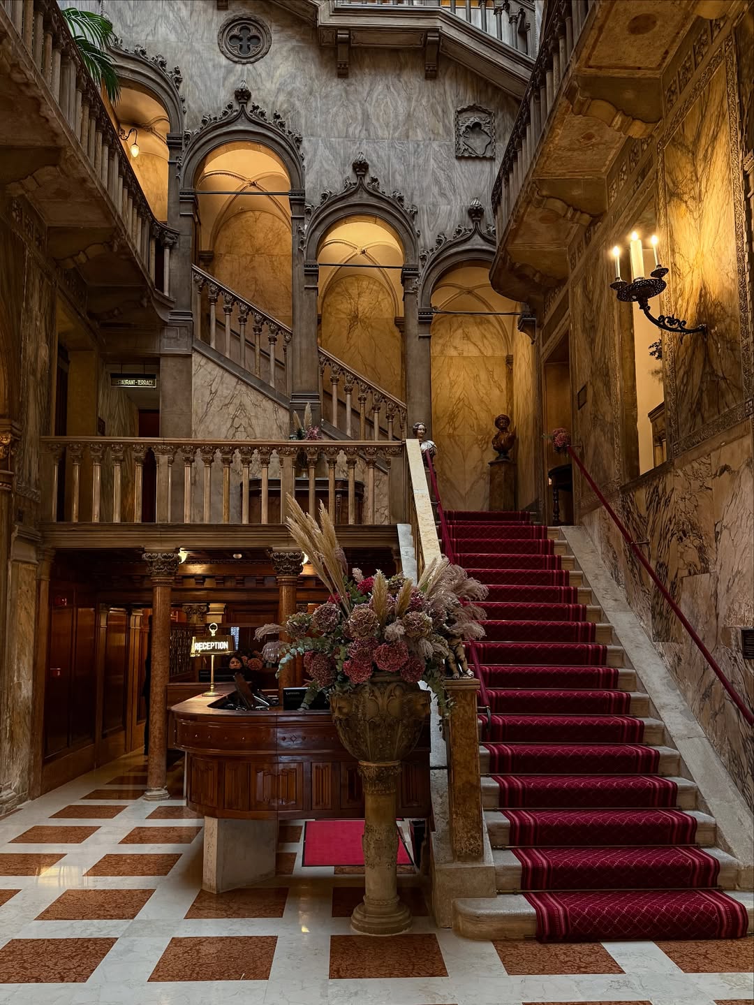 Ca’ Sagredo Hotel offers the kind of interior every photographer dreams of — grand but intimate, artistic yet personal. The staircase alone could fill an entire gallery of wedding portraits. The way its marble curves catch the light from the canal creates natural gradients that flatter any gown.