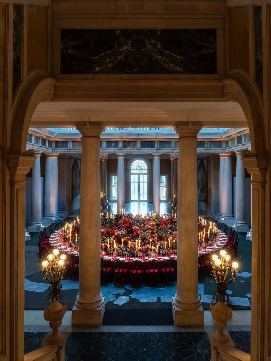 - The gilded ballroom during blue hour when chandeliers begin to glow.