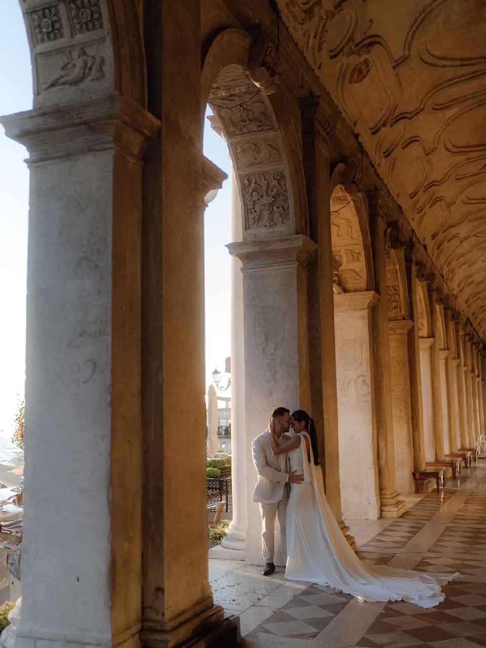 There’s no other place like Palazzo Ducale for wedding photography. Every corner of this historic palace — from the golden staircase to the loggias overlooking St. Mark’s Basin — feels monumental. Because of its architecture, the light here bounces beautifully across marble walls, creating natural radiance even without flash. Brides walking beneath the gilded ceilings of the Sala del Maggior Consiglio look like they’ve stepped into history itself.