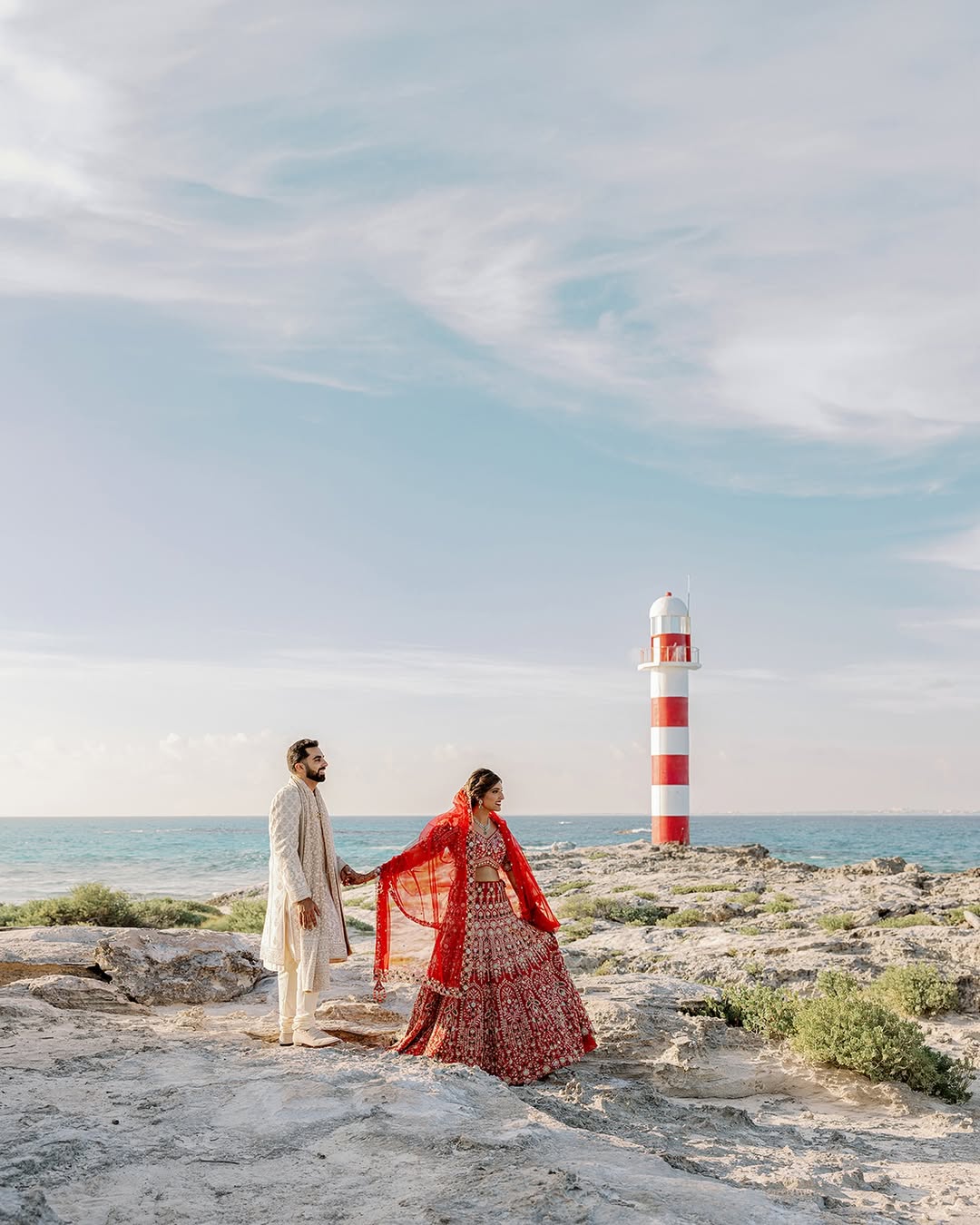 Majestic Elegance in Playa Mujeres brings a contemporary design sensibility to the beachfront wedding experience, making it one of the best Cancun wedding locations for couples who appreciate symmetry and clean aesthetics. The resort's modern architecture emphasises geometric precision, with symmetrical layouts, balanced compositions, and repeating patterns that naturally produce visually appealing images. This intentional architectural design means that portraits taken here have an inherently polished, magazine-quality feel. The clean lines and neutral colour palette provide an excellent backdrop for couples who want their personal style to take centre stage in their photographs. For South Asian wedding photography in Cancun celebrations, the spacious ballrooms and outdoor areas can host multiple events and ceremonies, and the contemporary aesthetic complements traditional attire without any cultural conflict.