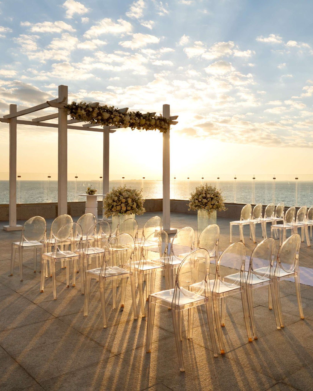 The adults-only policy at the TRS Coral Hotel immediately sets a different tone for wedding photography in Cancun, creating an atmosphere of sophisticated tranquillity that permeates the entire property and translates beautifully into wedding imagery. The resort exudes elegant restraint, featuring a muted colour palette, refined décor, and carefully curated spaces that feel more like a boutique hotel than a large resort. The rooftop areas offer unexpected photographic opportunities, providing elevated views of both the Caribbean coastline and the marina below. The marina setting adds nautical elegance, with luxury yachts and geometric docking structures providing alternative backdrops. The evening lighting at TRS Coral is particularly noteworthy, as the outdoor lighting design creates warmly illuminated spaces that photograph beautifully during twilight — that magical blue hour when artificial lights begin to glow, creating particularly romantic portrait opportunities.