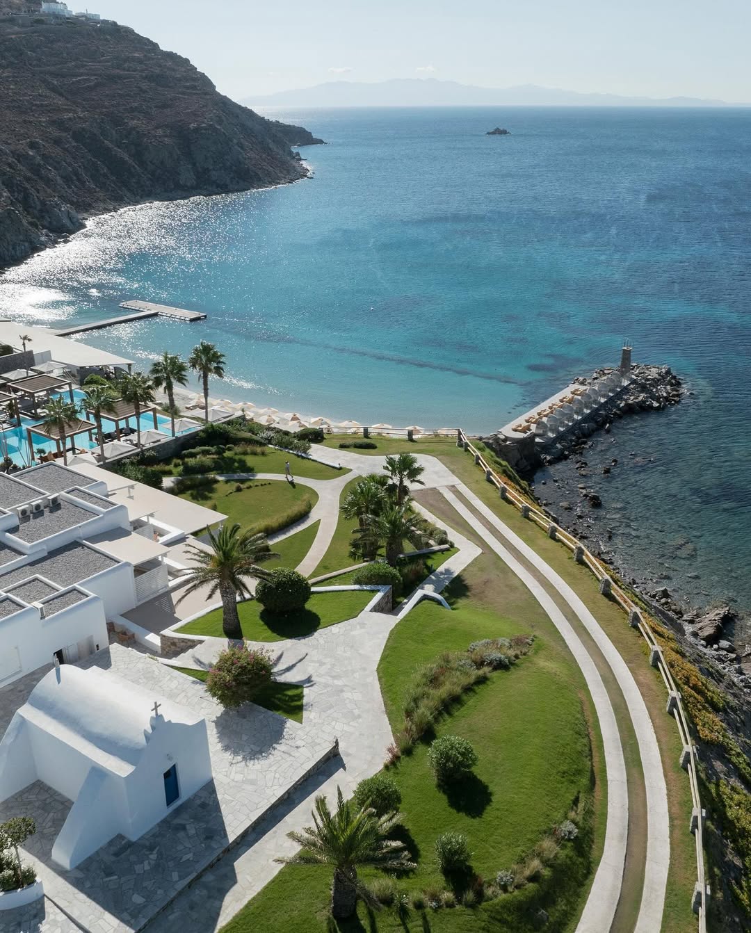 Santa Marina stretches out across Ornos Bay like a village that's always been there — whitewashed buildings connected by winding stone paths, private pools tucked away in terraced gardens, and views that keep changing depending on where you stop to take in the scenery. The resort is one of Mykonos's most established luxury properties, and it exudes quiet confidence. The staff move through the spaces as if they know what you're thinking; every terrace feels like the perfect spot to see the moment the light changes the water, and it feels like excellence here isn't just something that's done—it's just part of the place.