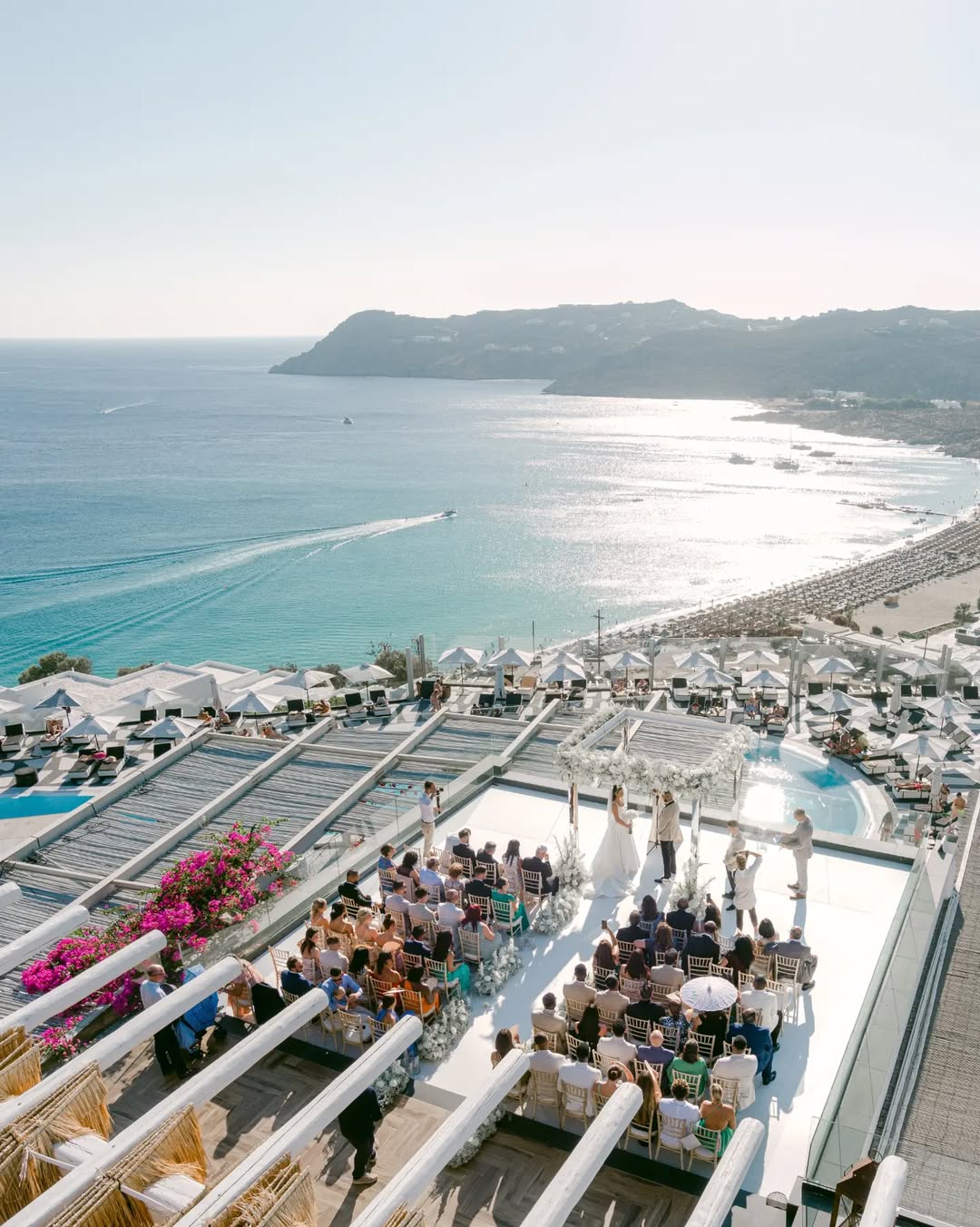 If you're a couple with a big group staying over a few days, the resort's size is actually a bonus. Guests can find their own rhythm — some go to the spa, others grab a lounger on the beach, and everyone meets up for planned stuff without the forced togetherness that smaller places sometimes create. Your welcome dinner, ceremony, and farewell brunch can all be in different places, each with its own vibe, making the celebration feel less like one big event and more like a proper experience. Santa Marina is one of the best wedding venues in Mykonos for couples who want a place for a big celebration that still feels stylish. It takes care of all the details so well that guests only notice how special everything feels, not the work that goes on behind the scenes.