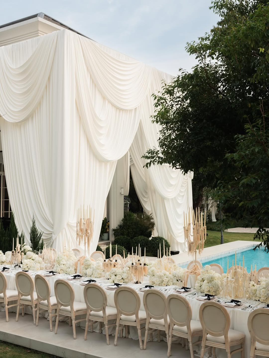 Rich textures are replacing expensive materials as the ultimate status symbol. "Draping!! Texture as a tactile statement like plush fabrics, layers, embroidered tulle over linen!" exclaims Stress & Success Event Planners, highlighting how couples are prioritizing sensory richness over traditional opulence.