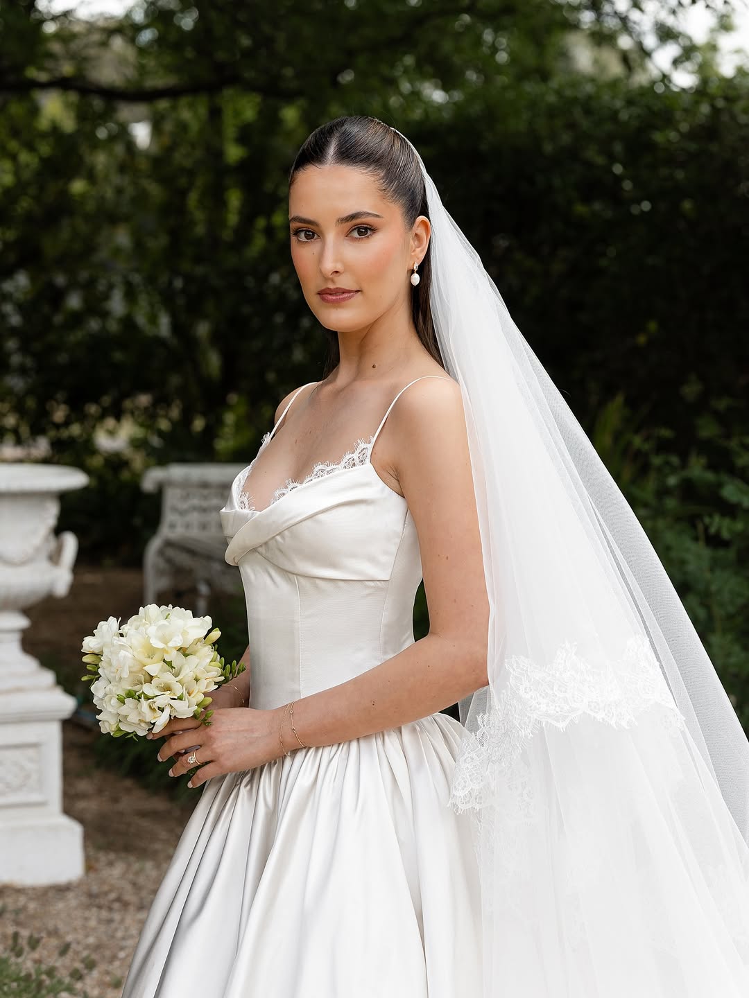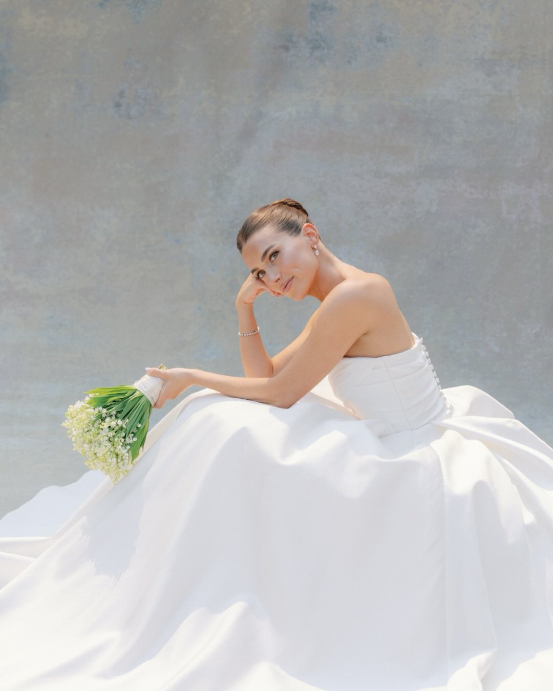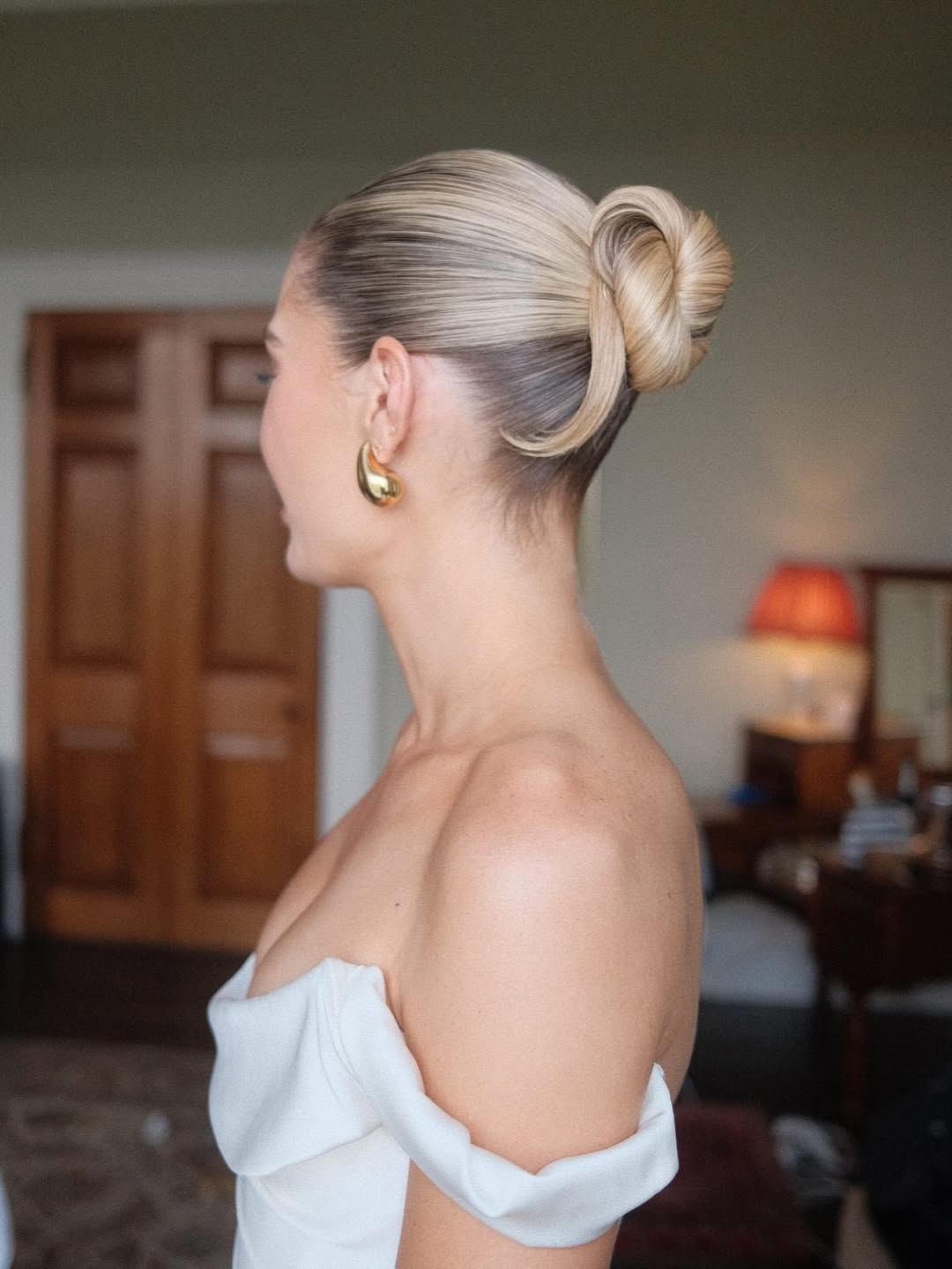 The mood is controlled by elegance. This is the bride who chose a minimalist gown and appreciates clean aesthetics; she wants photos that show sophistication rather than styling trends from a specific era. For city weddings, contemporary venues, or celebrations with a modern, refined aesthetic, the sleek low bun delivers exactly the right energy.