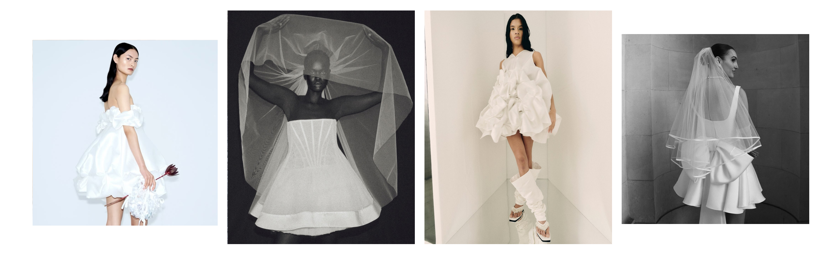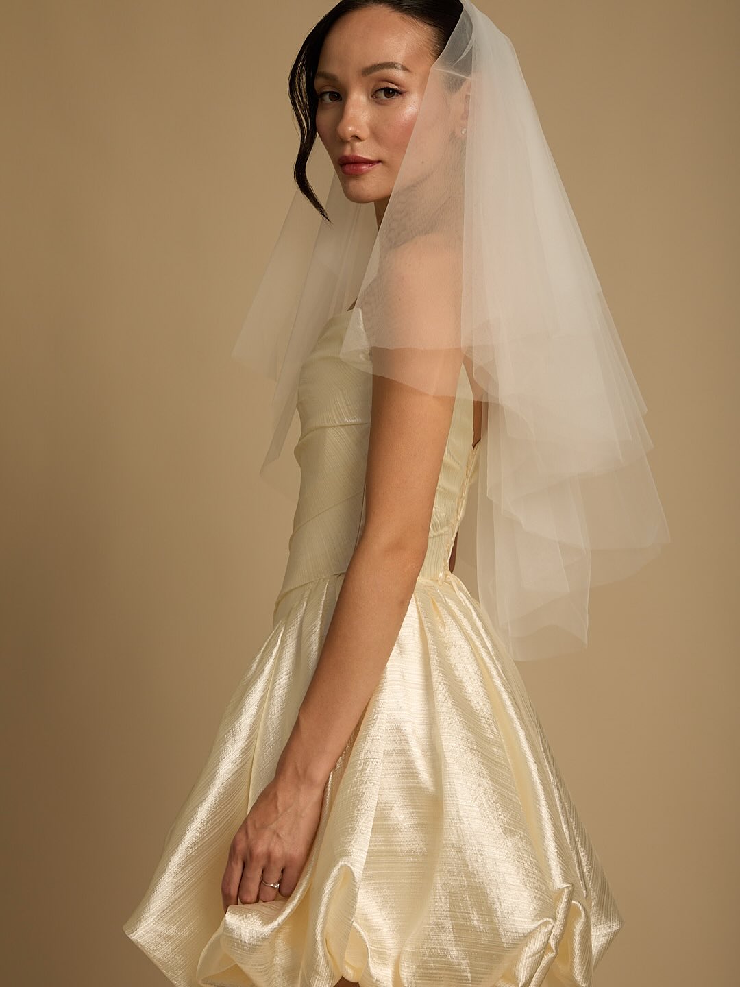| Bubble Mini Dress | Shoulder-length veil; Birdcage veil | Sculptural heels; Satin pumps | Sleek bun; Metal or pearl earrings; Structured mini clutch |