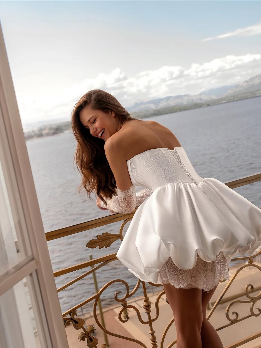 The bubble or boule shape has become the most recognizable sculpted style in short wedding dresses in 2026. It is both bold and playful, firm but soft. Picture a fitted top that flows into a rounded, cocoon-like skirt that narrows at the bottom, creating the classic balloon or bubble look. This style started in high fashion and is now popular in wedding dresses, offering something that long gowns cannot: a three-dimensional shape that looks like a piece of art in photos from every angle. A wedding mini dress in bubble style moves with you—the rounded shape sways and bounces as you walk, adding energy to your look. It feels joyful, perfect for a celebration, yet still elegant thanks to its careful design. The bubble style of 2026 is flexible. A simple satin bubble dress looks modern and clean. Add texture or decoration, and it becomes rich and romantic. The shape works just as well for the ceremony as for a mini bridal reception dress in the evening, giving you a dramatic "second look" when you want to dance without losing style. Designers create the bubble effect in different ways, like using hidden hoops, careful gathering and folding, or weighted hems that make the skirt curve in. The result is a short wedding dress that stands out for its shape, not just its decoration—the dress is like a piece of art you can wear and is also easy to celebrate in.
