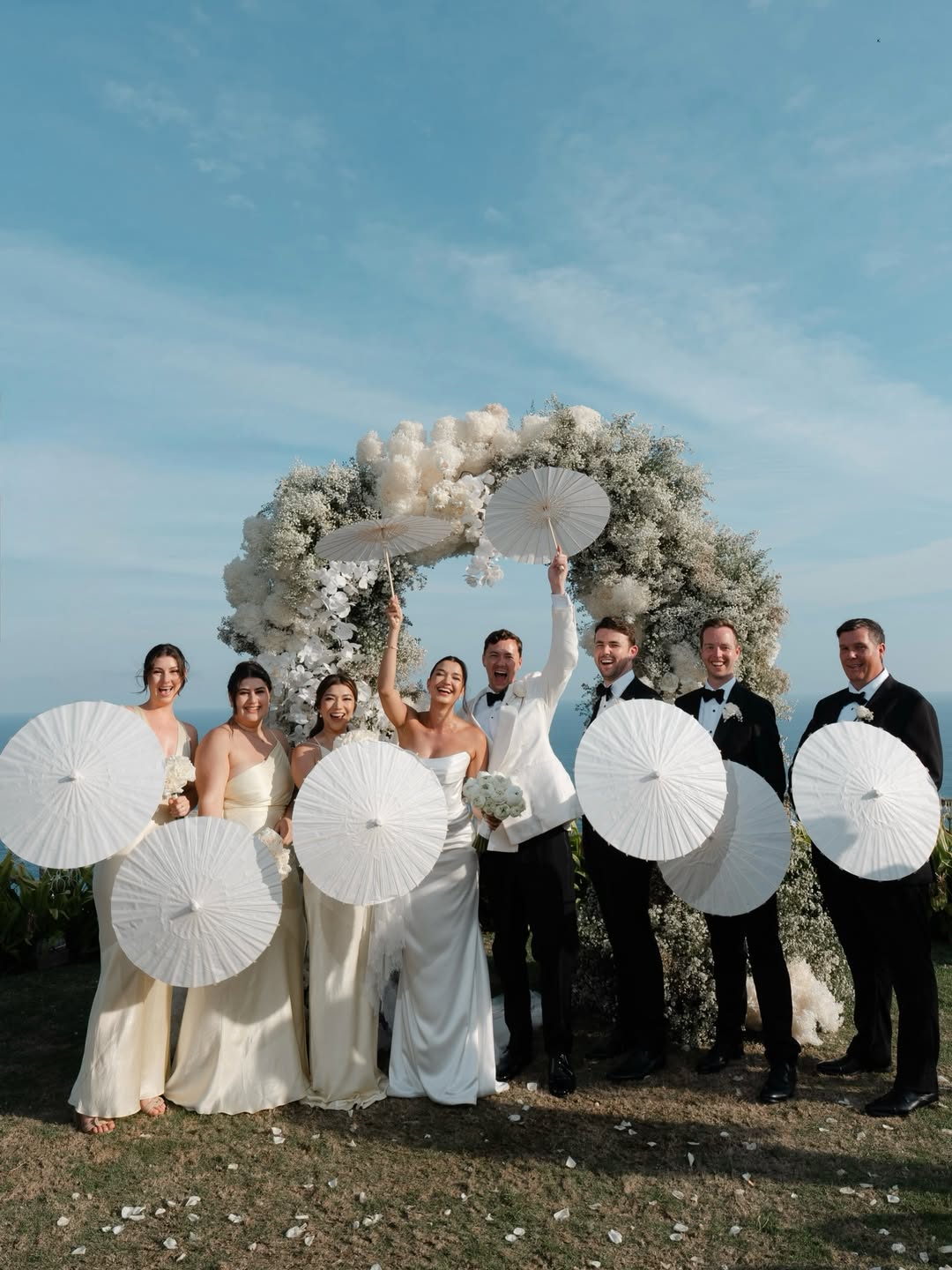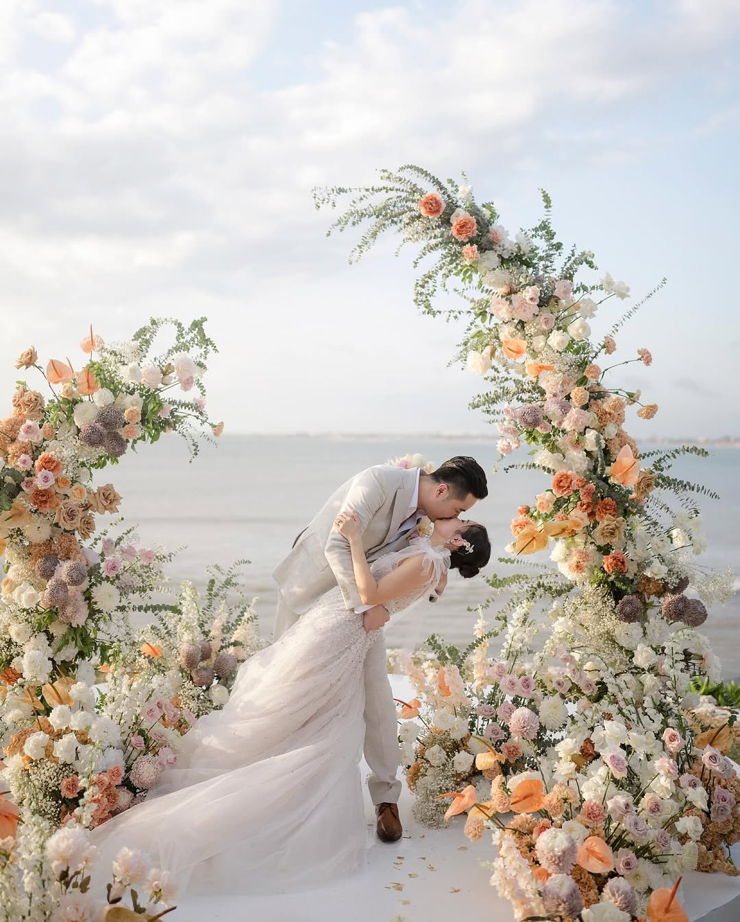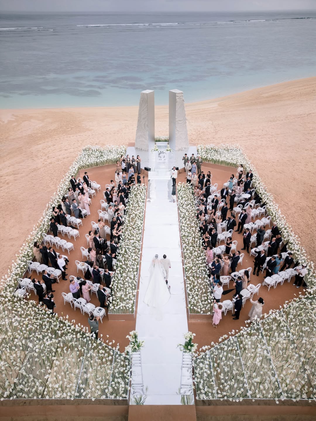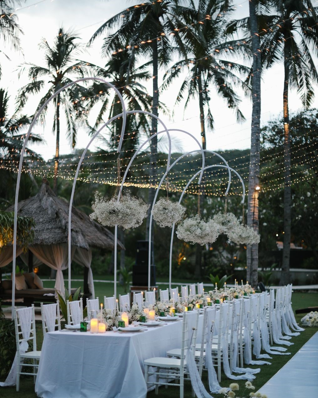 The Gili wedding style is relaxed but still elegant. Imagine textured neutral linens like gauze runners and raw-silk napkins, simple wooden furniture instead of formal chairs, and Edison-bulb lighting instead of chandeliers. The idea is to create elegance through simplicity, with thoughtful details that don’t feel too traditional. This style works with the natural setting, making the beach stand out. Boho and organic tropical styles use color, texture, and natural materials—like macramé backdrops, pampas grass, low seating with floor cushions and rugs, and lots of greenery instead of flowers. This look feels layered and personal, as if you’ve collected special pieces, creating a warm, welcoming atmosphere for daytime ceremonies and relaxed receptions. A minimalist white beach wedding is different, with white and cream tones, clean lines, and very few extras—the arch, chairs, tablecloths, and flowers are all white, with just a bit of greenery, while the beach and ocean add color. This style takes confidence because every detail stands out, but when done well, it’s beautiful and lets the natural setting shine. Editorial and fashion-inspired weddings are styled like a photo shoot, focusing on how everything looks in pictures. You might see bold colors, sculptural flowers, unique table settings, dramatic lighting, and striking outfits. Couples who choose this style often work with planners and designers who know how to create magazine-worthy looks, carefully selecting every detail for its visual impact rather than following traditional rules.