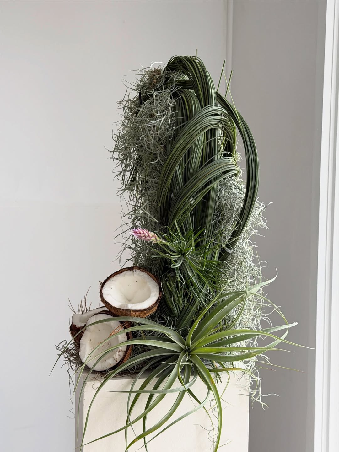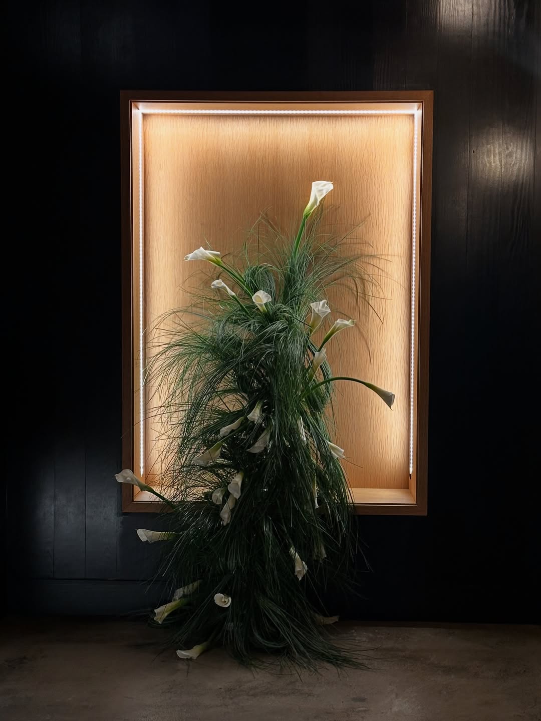Wedding floral sculptures inspired by nature create the most striking biomorphic designs. These pieces look as if they have grown naturally into their shapes. You might see spiraling vines that follow Fibonacci patterns, branches that stretch out and seem to float, and cascading elements that look like waterfalls or wind-blown grasses. The best bespoke wedding flower art in this style uses more than just flowers. Moss adds texture, bare branches give structure, ferns bring a timeless feel, and grasses add movement. These arrangements balance a sense of wildness with clear artistry, blending natural chaos with careful design.