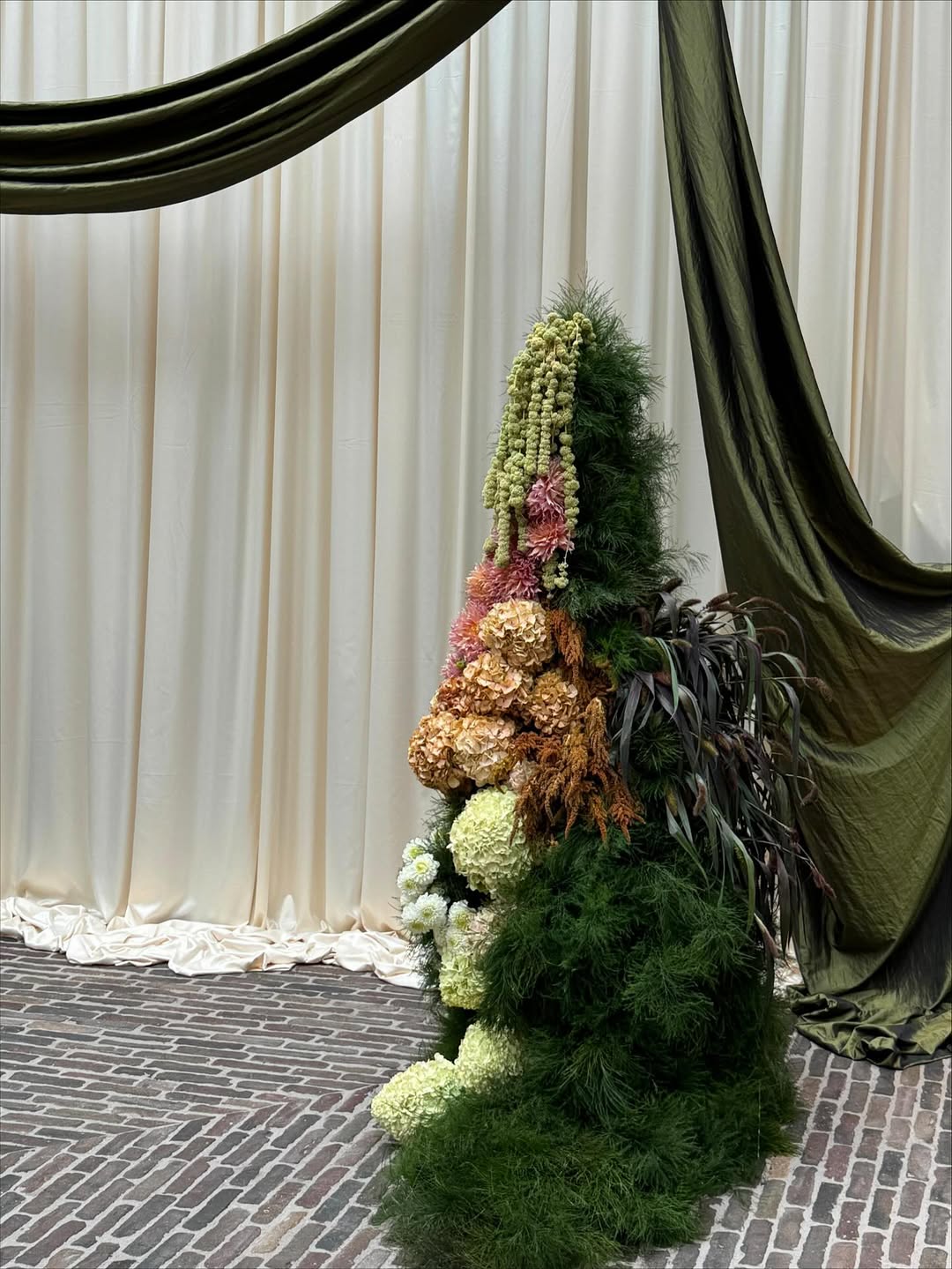 When colour takes centre stage, sculptural wedding flowers make a bold impression. Instead of soft, blended palettes, this style uses rich, monochromatic arrangements, letting a single hue shape the entire design. Picture an installation in deep burgundy, with roses, dahlias, amaranthus, and velvet fabric coming together as one striking piece. Or, think of electric fuchsia flowers arranged in geometric shapes that look more like modern art than classic floristry. This kind of floral art for weddings is inspired by fashion shows and art galleries, where colour leads the design instead of just adding decoration.