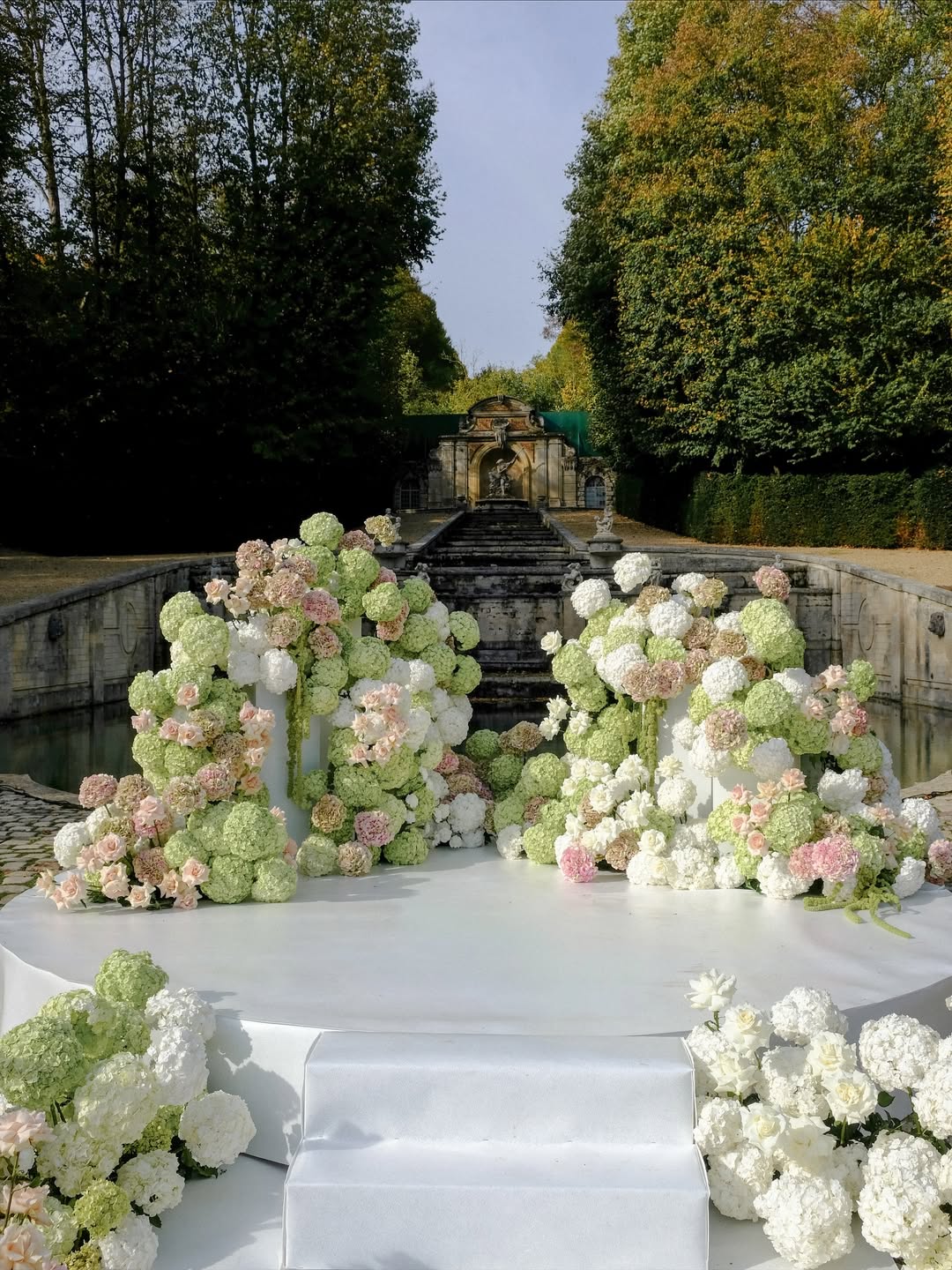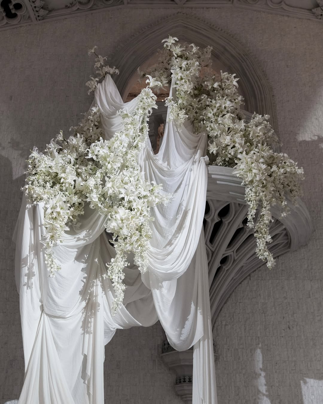 Sculptural floristry in soft, muted tones creates an architectural look without using competing colors. These arrangements highlight form over color. Custom wedding flowers in whites, ivories, creams, and gentle neutrals draw attention to texture, shape, and shadow. Designers working with this palette often use fabric draping and layered petals to add depth, choosing flowers for their structure rather than their color. The result is almost architectural, with installations that shape the space, play with light, and set the mood through volume and open areas rather than bold colors.