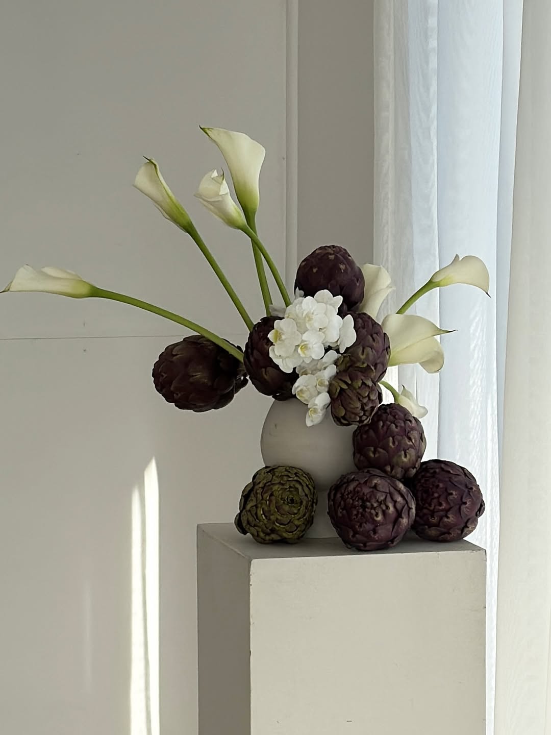 | Minimalist | Monochromatic blooms, limited variety | Single fruit type, sparingly used | Clean lines, architectural | Ceramic, simple metal | Sculptural, intentional |