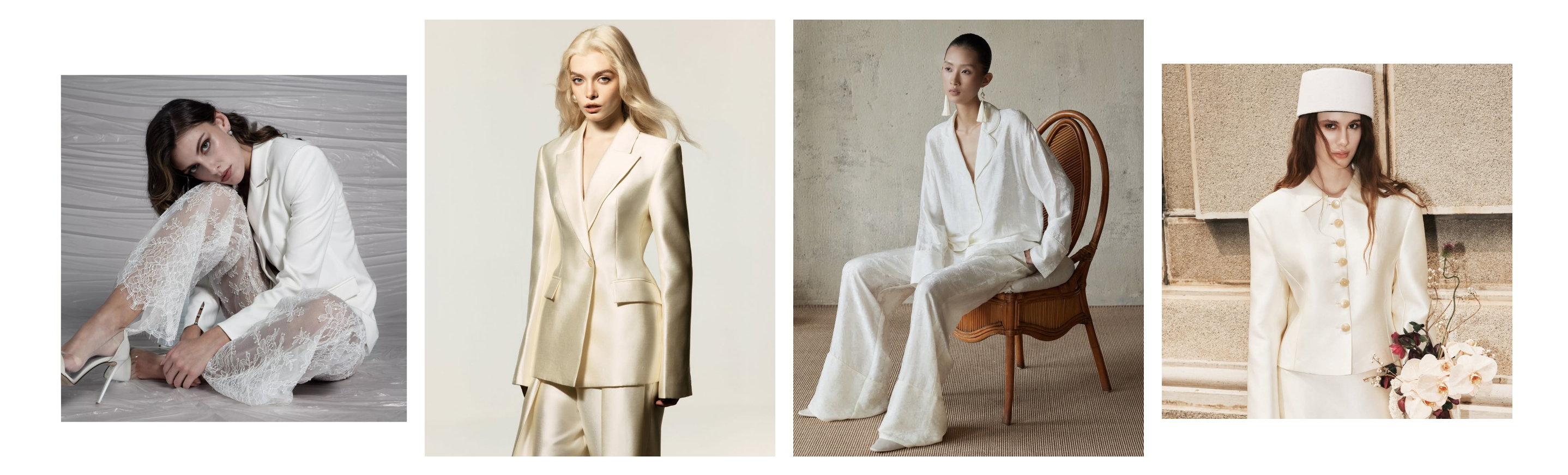 - Texture and layering add depth. Wearing a silk camisole under a blazer adds a bit of quiet luxury. A soft lace bodysuit adds romance. Tying a bold silk scarf around the neck brings old-fashioned elegance. Wearing a see-through blouse under a fitted blazer makes the outfit look more interesting. These layers keep the white bridal suit from looking plain or flat in photos.
