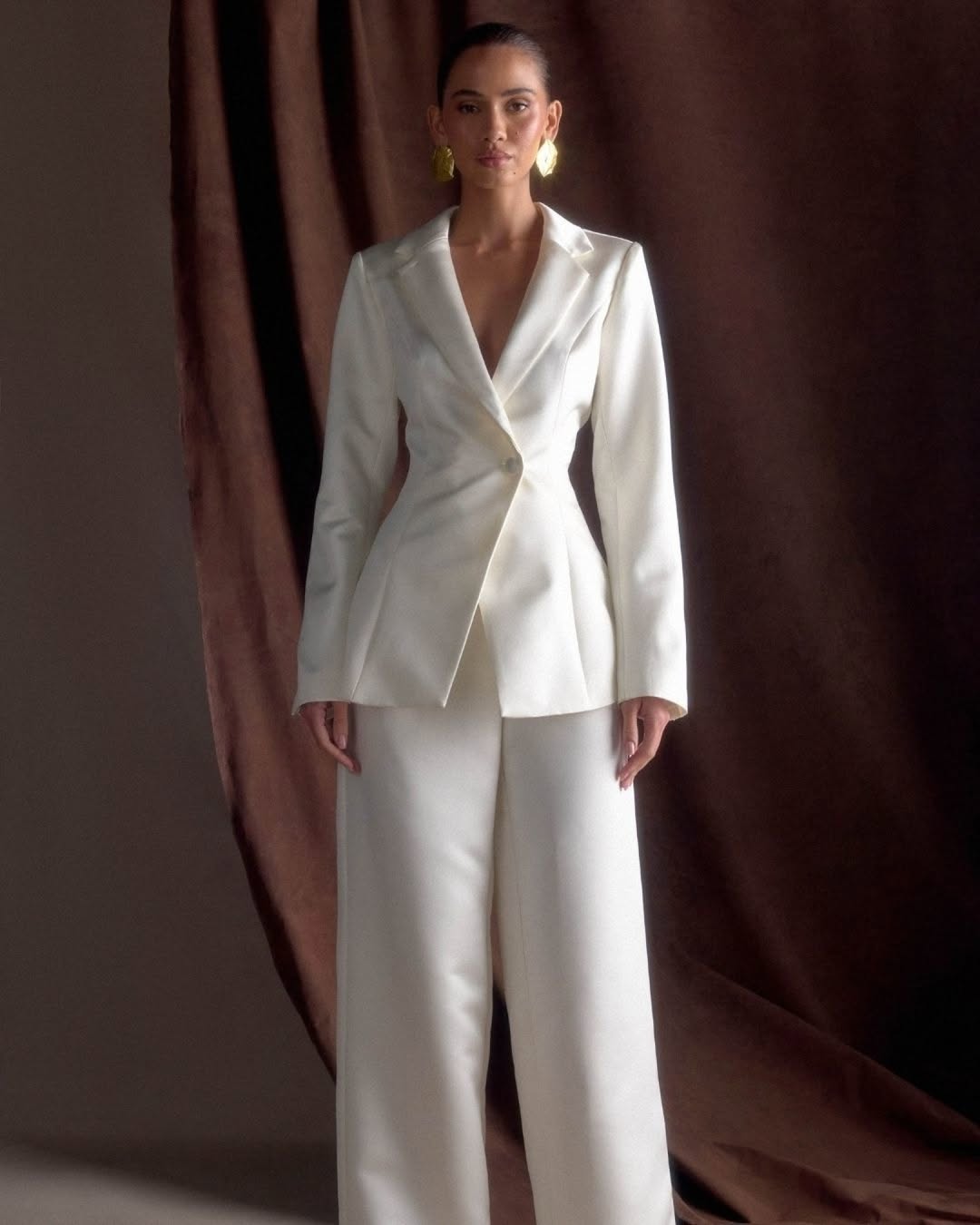 - Jewellery adds personality and style. Large pearl earrings respect bridal tradition while still looking modern. Bold gold pieces match the suit's strong shape. Simple, geometric jewellery keeps the look clean while still being interesting. The key is to pick pieces that add to the look, not fight with it. If your white wedding suit for a bride is heavily decorated, keep jewellery simple. If the suit is plain, jewellery can be bolder.
