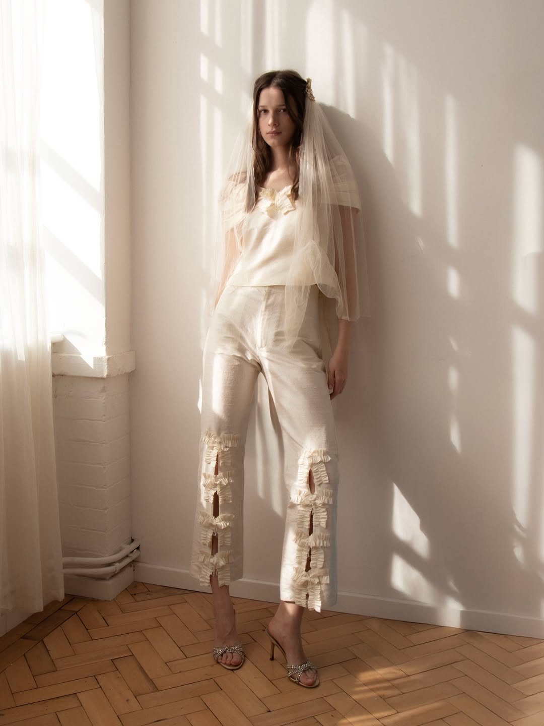 - Veils instantly create a bridal look. A long veil trailing behind a sleek pantsuit, for example, creates a beautiful contrast between sharp tailoring and soft fabric. Shorter, shaped veils or birdcage veils add old-fashioned romance without detracting from the suit's simple look. Even a simple fingertip veil can turn an elegant outfit into a wedding look.
