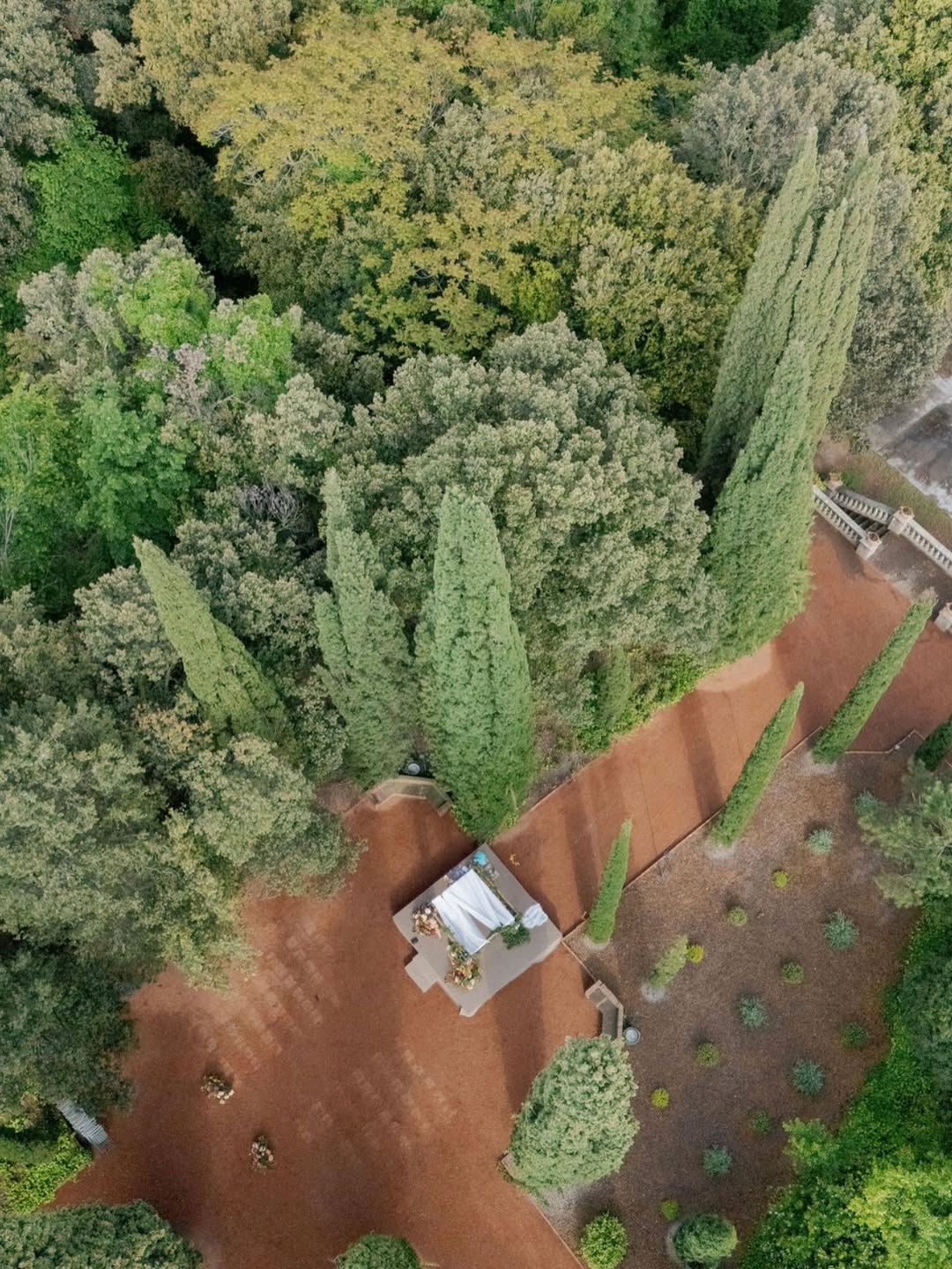 The garden's name is an accurate reflection of its nature. The unique terracotta sand gives rise to a distinctive landscape that is truly one of a kind. A symmetrical design is showcased, with ancient holm oaks and cypress trees standing guard. An original spiral staircase winds up one side, while an elegant 20th-century staircase balances the other.