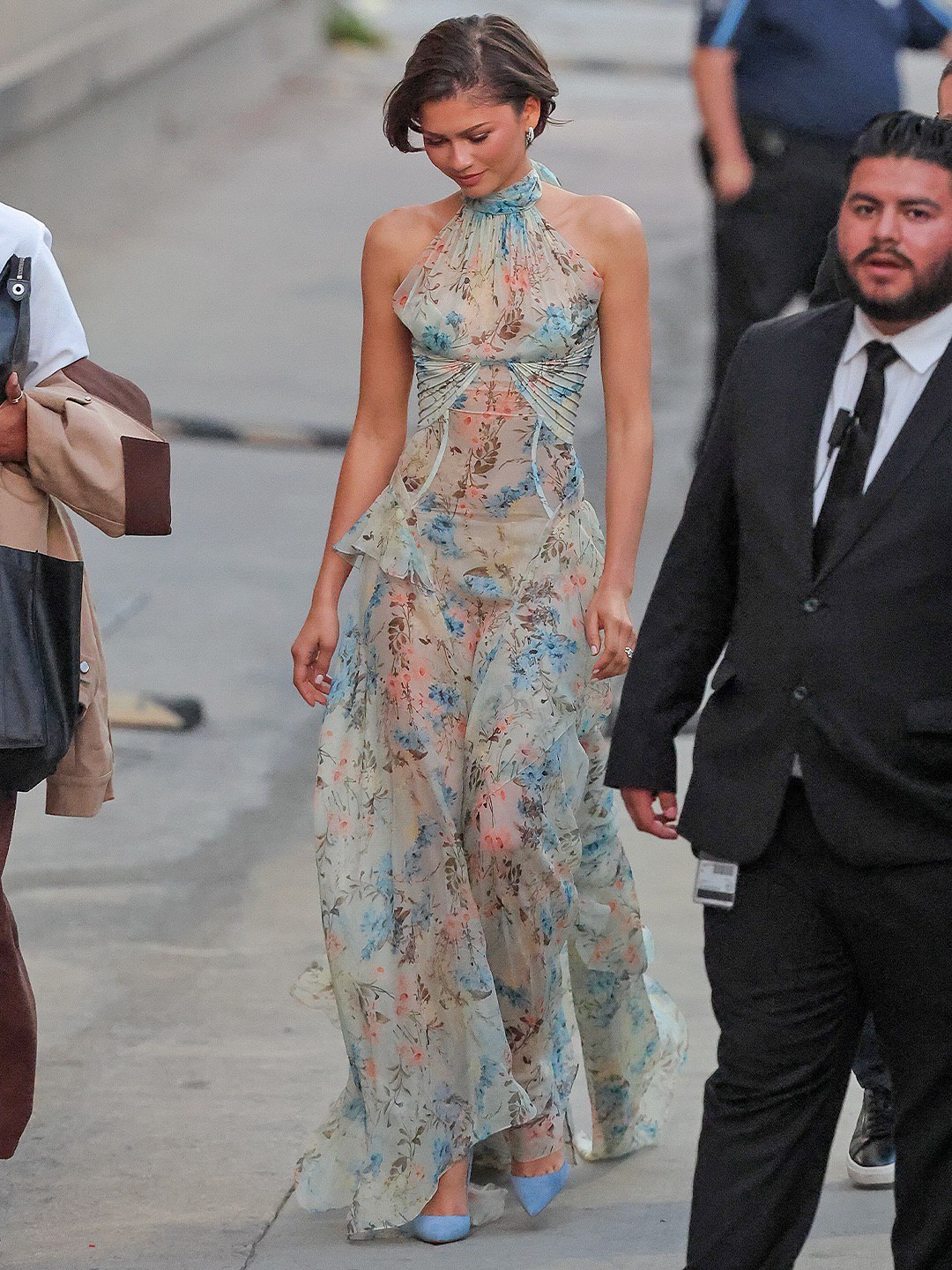 Not every look in the tour followed the bridal white script. During a Paris press day, Zendaya wore a tattered blush dress covered in 3D rosettes from Matières Fécales — and later, a Zendaya floral bridal moment arrived in the form of an Alexander McQueen sheer gown with corset detailing in wallpaper, floral-printed silk georgette, and chiffon during her LA talk show appearances. Ethereal, romantic, and entirely wearable as a bridal inspiration reference.