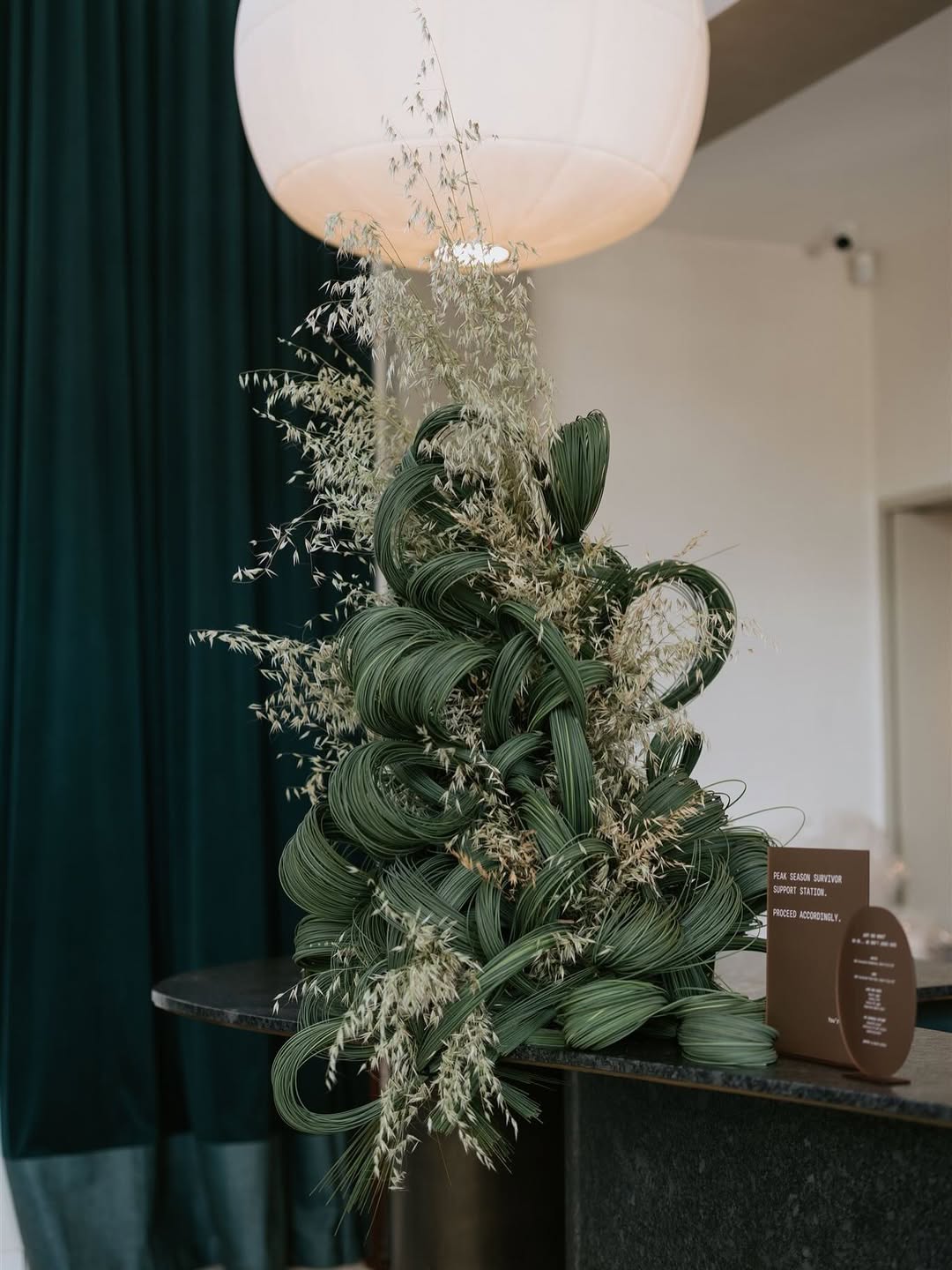 - Foraged touches include twisted branches, dried grasses, and local winter greenery.