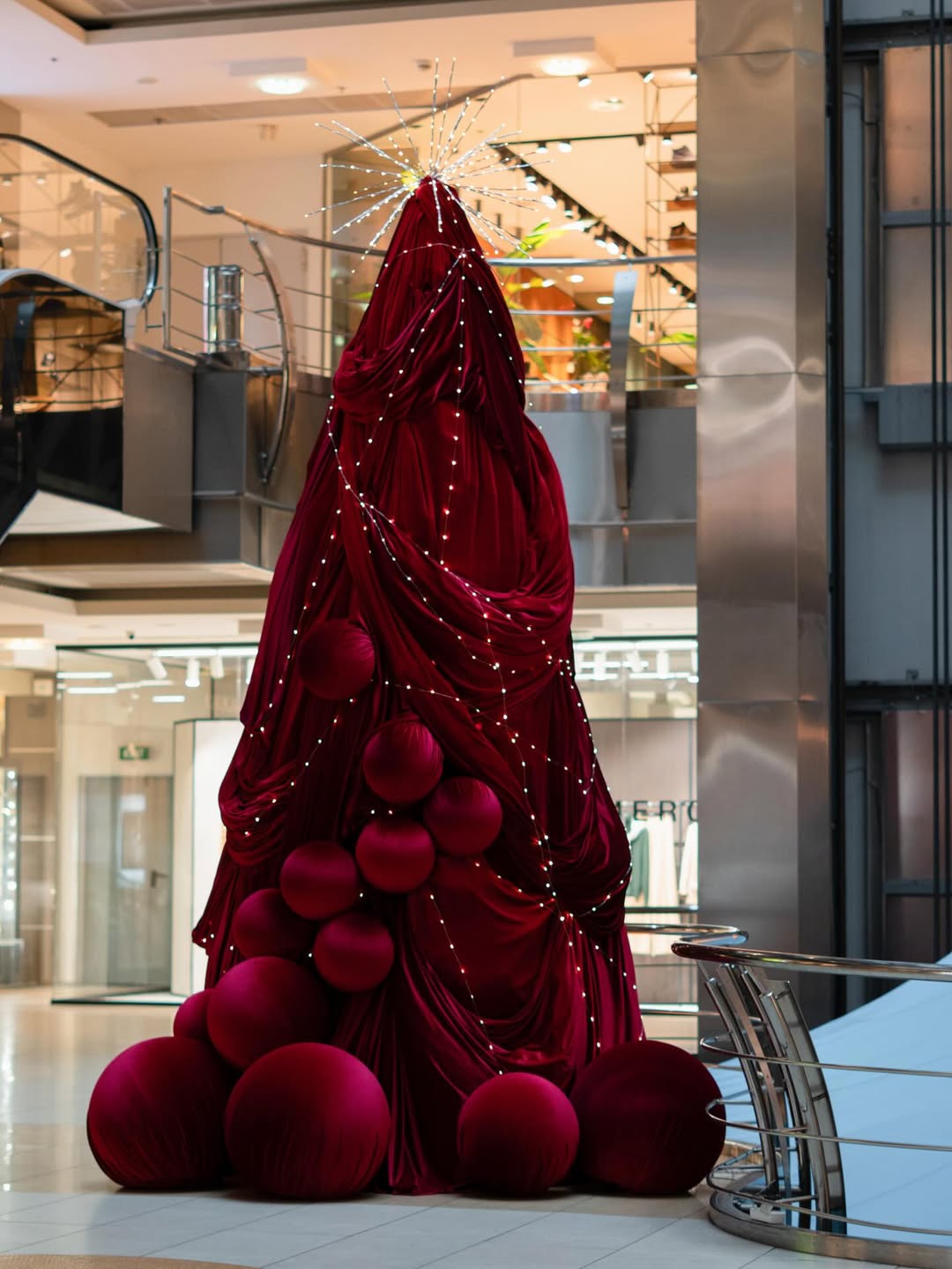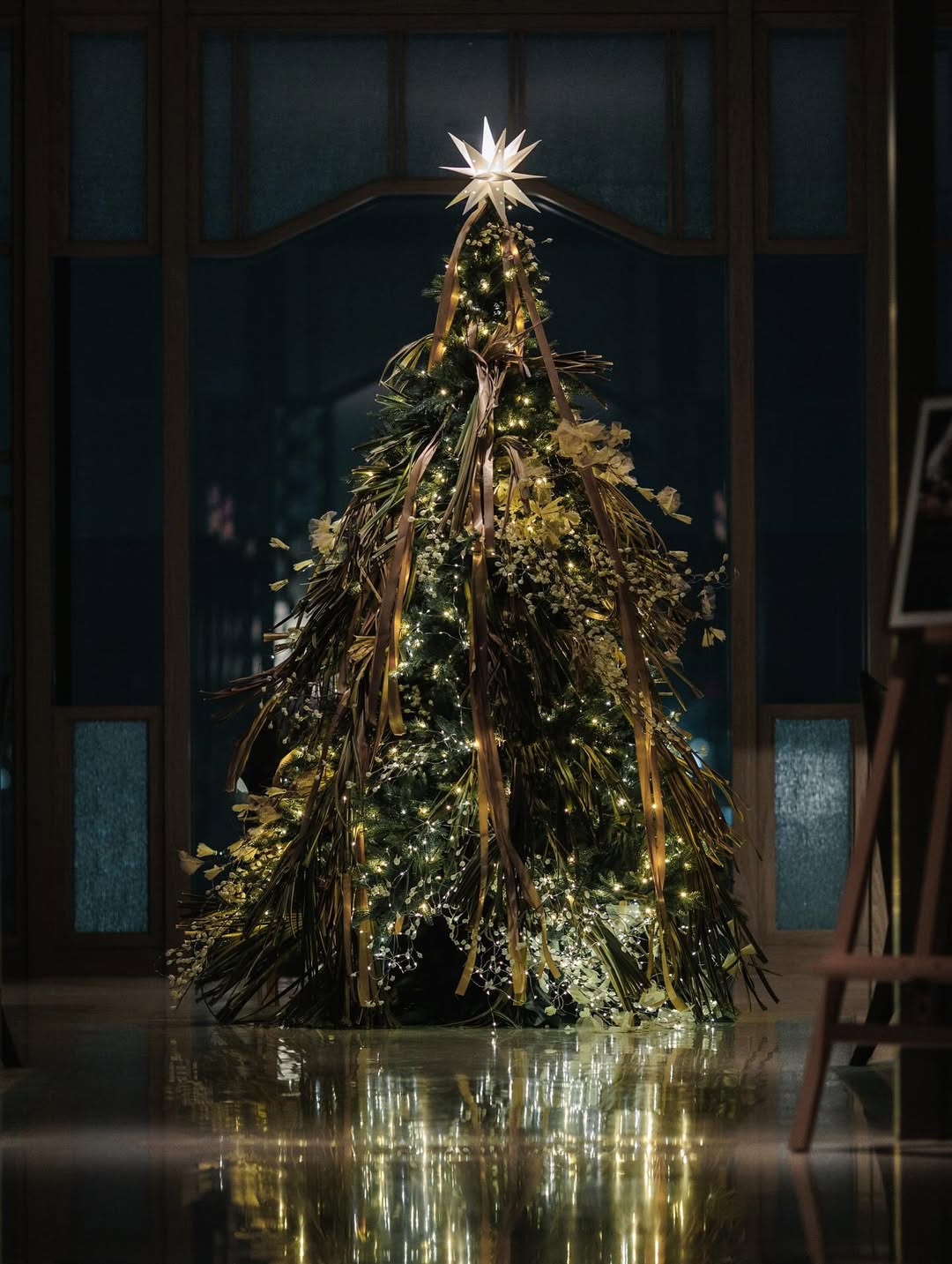 A Christmas tree wedding backdrop can feel more like an art installation, making the tree the main sculptural element rather than just a festive detail. These trees go beyond simple ornaments. They are three-dimensional designs that might use surprising materials, include hanging elements, or be arranged in ways that challenge your idea of what a tree is. You can clearly see the influence of fashion design here. The creative approach used in runway installations often shows up in wedding Christmas tree decorations, which sometimes look more like works of art than playful decor.