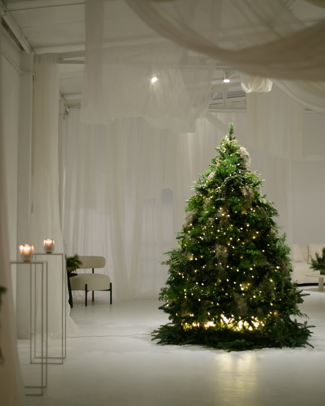 These creative trees all share a gallery-inspired look. Some are made from geometric frames, some are wrapped in simple fabric, and others use lighting to look like glowing sculptures. The Christmas tree becomes the main visual focus of the wedding, and it’s what guests remember, photograph, and talk about after the event. Placing an artful tree in the welcome area makes a strong first impression and sets the tone for the rest of the celebration. This bold style works especially well for editorial weddings, luxury events, fashion brand parties, and concept venues, where guests expect to see something fresh and exciting instead of the usual traditional decor.