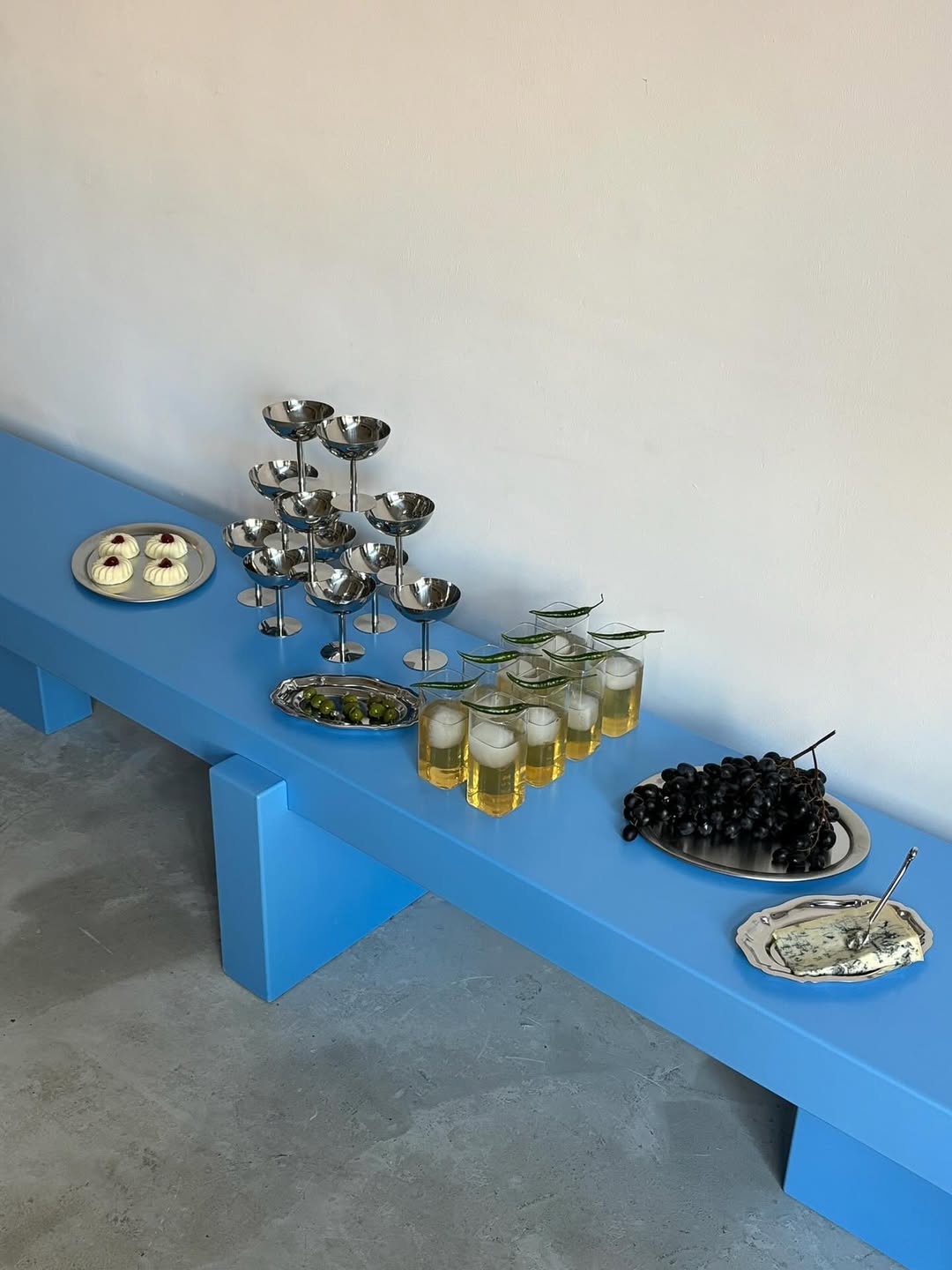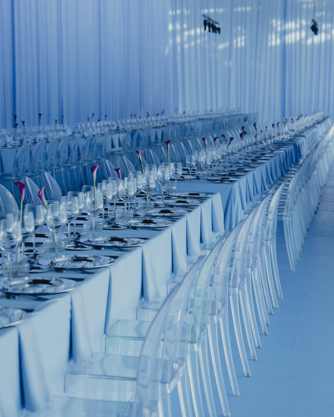 - Table settings with blue glassware or china details