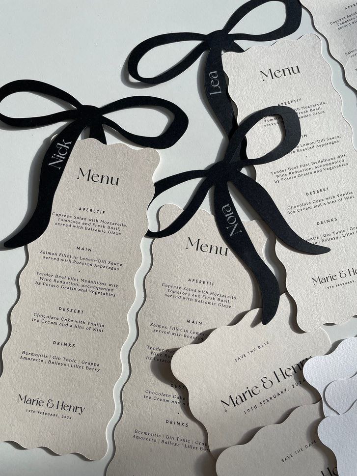 There's something magical about bringing old-world elegance to your modern celebration. These menu cards feature romantic curved edges and luxurious black ribbon ties that whisper sophistication. The vintage-inspired typography paired with that dreamy scalloped border creates an heirloom quality that you'll treasure in your wedding album years later. Your guests will feel like they're dining in a fairytale castle.