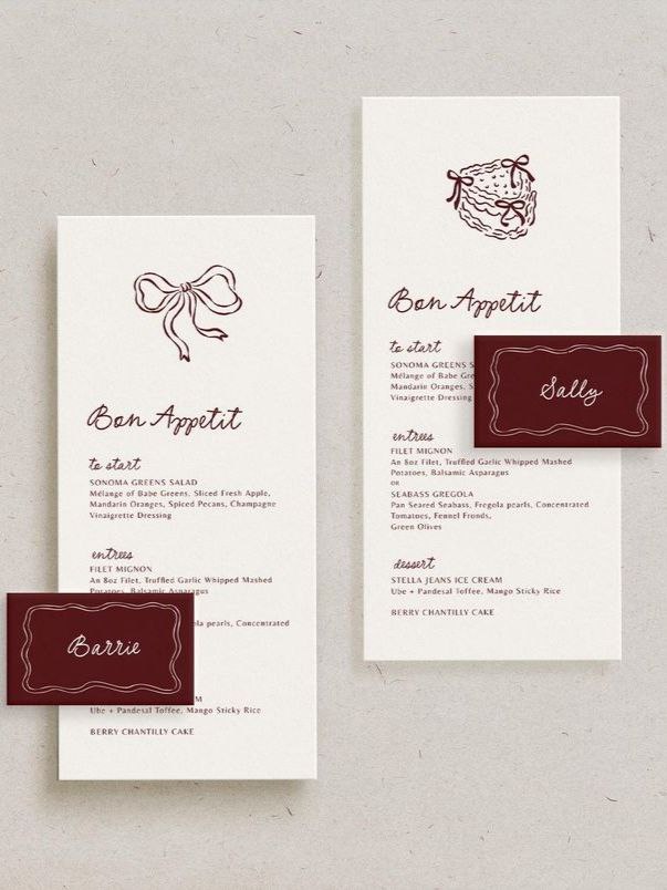 Bold is beautiful, and we're absolutely obsessed with menu cards that make a statement through color. Deep burgundy accents paired with elegant script fonts create a sense of luxury that's impossible to ignore. These rich, saturated hues work perfectly with your autumn or winter wedding palette, adding warmth and drama to your tablescape. You'll love how these colors photograph against your floral arrangements.