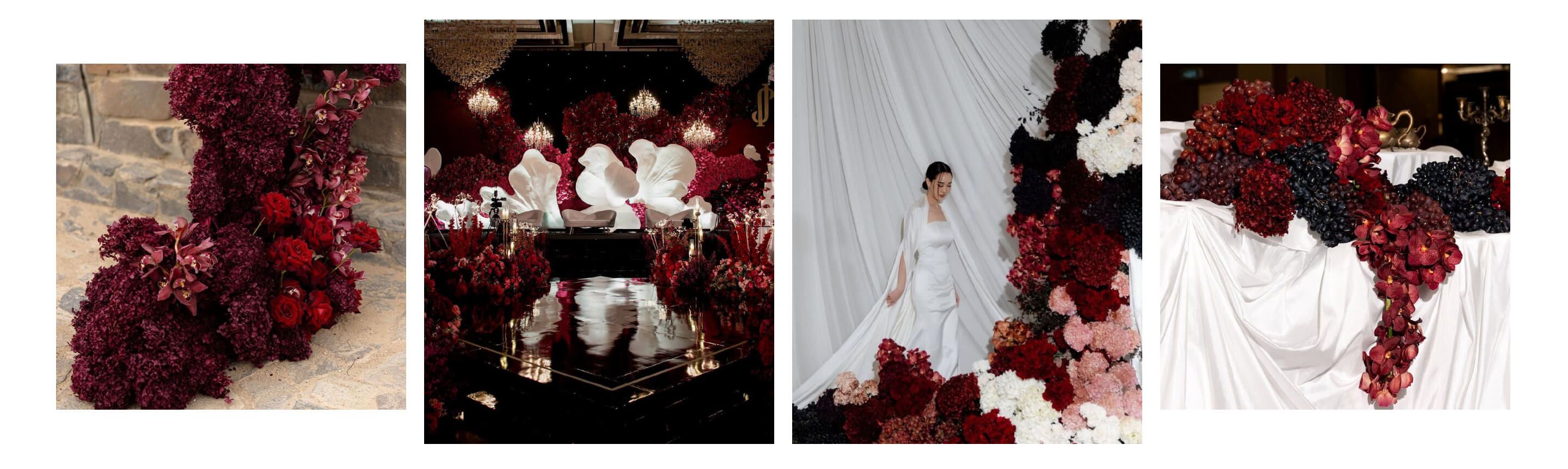 One of the best aspects of a burgundy wedding theme is its versatility in pairing with other colors. Burgundy wedding colors ideas offer endless possibilities to create a beautiful and cohesive palette for your celebration. Burgundy can be combined with a variety of shades to create a balanced and harmonious look. Below are some excellent color combinations for a burgundy theme wedding:Burgundy and Gold: Gold accents can elevate the richness of burgundy, creating a luxurious and glamorous atmosphere. Consider gold-rimmed glassware, gilded picture frames, and golden cutlery to complement burgundy wedding decorations like florals and fabric. The combination of burgundy and gold works particularly well for a black-tie wedding or an elegant ballroom setting.Burgundy and Blush: For a softer, romantic feel, blush tones paired with burgundy create a beautiful contrast. The gentle warmth of blush pink balances the boldness of burgundy, resulting in a charming and refined aesthetic. This combination is perfect for a spring or summer wedding and works wonderfully for wedding invitations, bouquets, and bridesmaids' dresses.Burgundy and Navy: If you're aiming for a more sophisticated and modern look, pairing burgundy wedding themes with navy blue creates a rich, regal vibe. Navy complements burgundy’s deep hues while adding a cool tone to the overall palette. This combination is ideal for winter weddings or evening affairs, where you want to evoke a sense of luxury and elegance.Burgundy and Ivory: Ivory is a timeless and classic color that works perfectly with burgundy. This combination offers a subtle contrast while maintaining an air of elegance. Whether in the form of wedding dresses, table linens, or stationary, ivory softens the boldness of burgundy, creating a harmonious and refined setting. This pairing is perfect for traditional weddings and will never go out of style.