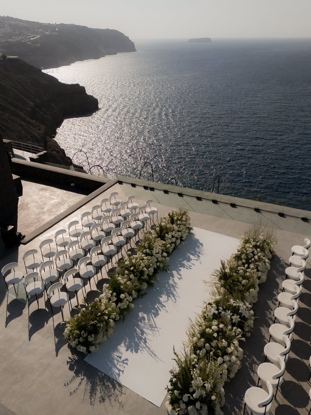 The ceremony takes place on the highest level of the estate. Uninterrupted views of the caldera create an unparalleled backdrop for the most important moment of your life. As you exchange your vows with the iconic windmill standing sentinel and the endless Aegean stretching before you, your photographer and videographer will capture images so stunning, you'll treasure them for a lifetime.