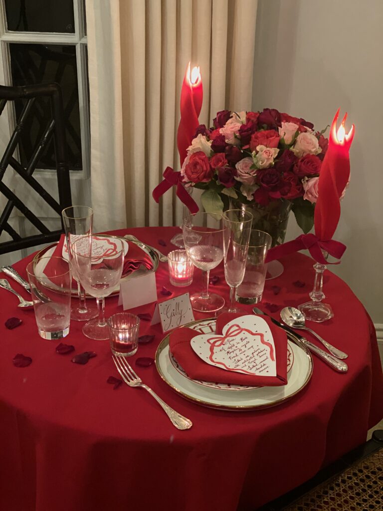 Here's the move that actually gets people talking: hand-lettered heart-shaped menu cards at each place setting. Write a sweet note, your names, or even inside jokes inside the shape. It's intimate, it's personal, and it completely changes the energy of your table. Layer this with subtle heart confetti or small pressed flowers scattered across the table – nothing overwhelming, just enough that guests notice and appreciate the intentionality.
