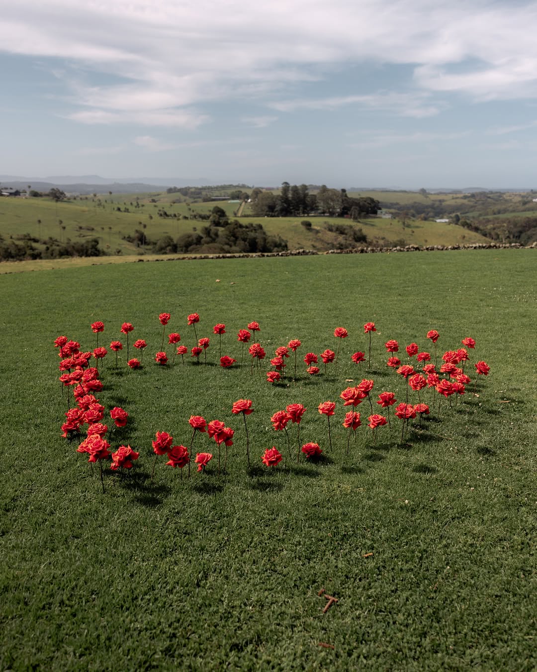 Go bold with red velvet draped into a heart shape, layered with cascading florals and unexpected sparkle. It's theatrical, it's luxe, it hits different. For something sleeker, a clean geometric heart frame in rose gold or champagne metal works beautifully – minimal florals, maximum impact. Or go full immersive: scatter flowers across an outdoor space to form a massive heart where your guests sit inside the shape during your vows. The symbolism, the photos, the entire energy shifts.