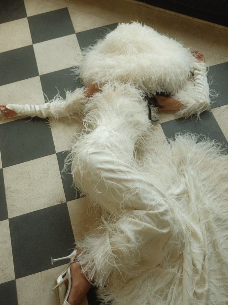 The color possibilities are endless too! While white and ivory are classic choices, don't overlook blush pink feathers for a romantic touch, or even black feathers for a dramatic, haute couture moment that'll be absolutely unforgettable.
