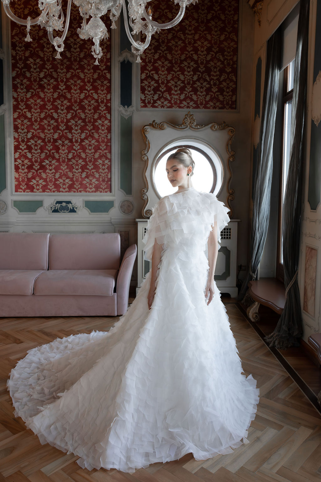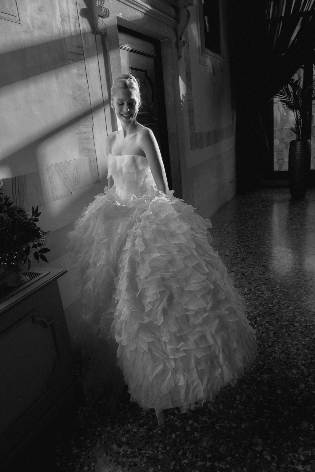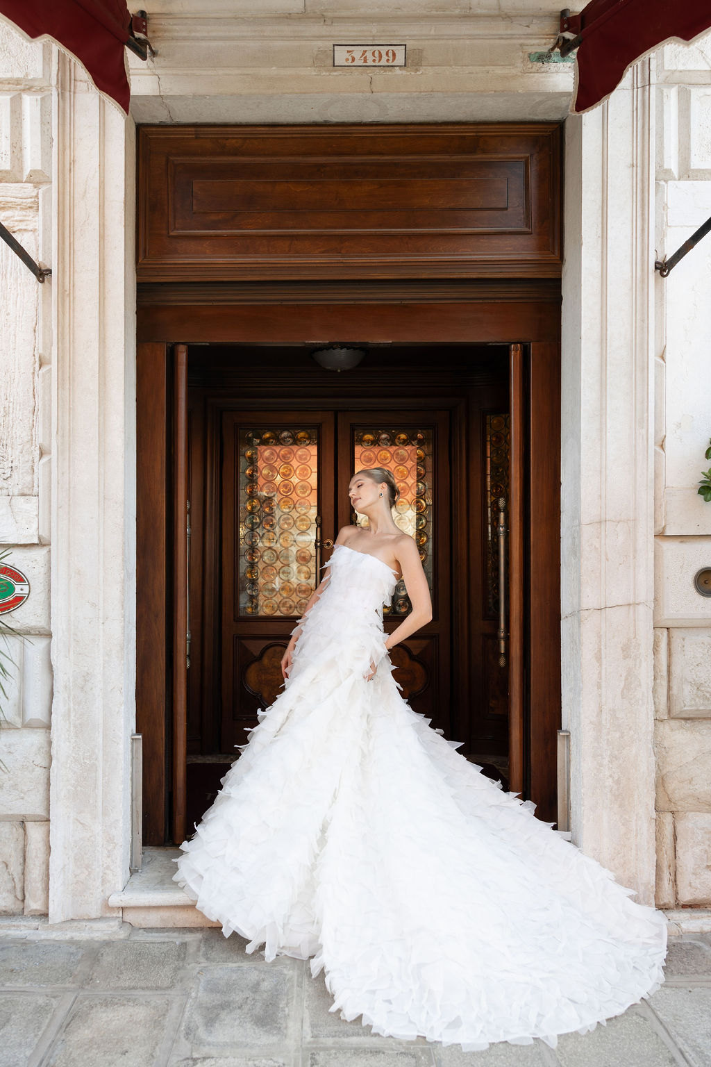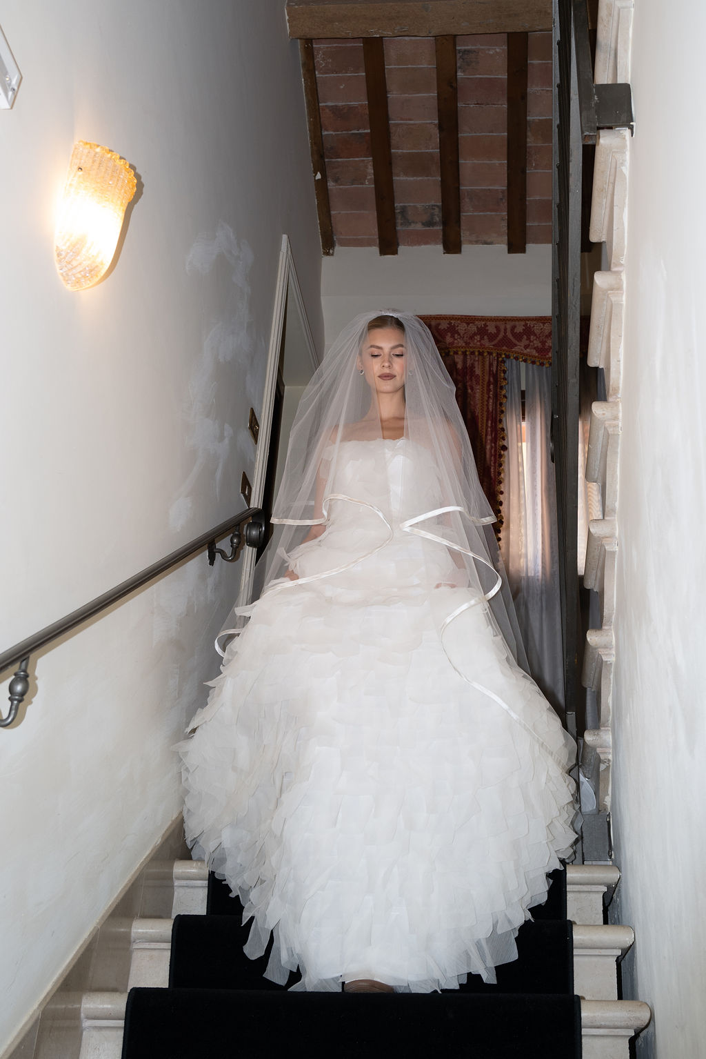 Milan-based designer Peter Langner created three gowns for the bride, all handmade in his atelier. His work is known internationally for architectural lines, refined minimalism, and the kind of impeccable craftsmanship you can see in every seam. The collection balances timeless elegance with contemporary design—one dress was conceived with a strong focus on sustainability, reflecting a more conscious approach to luxury.