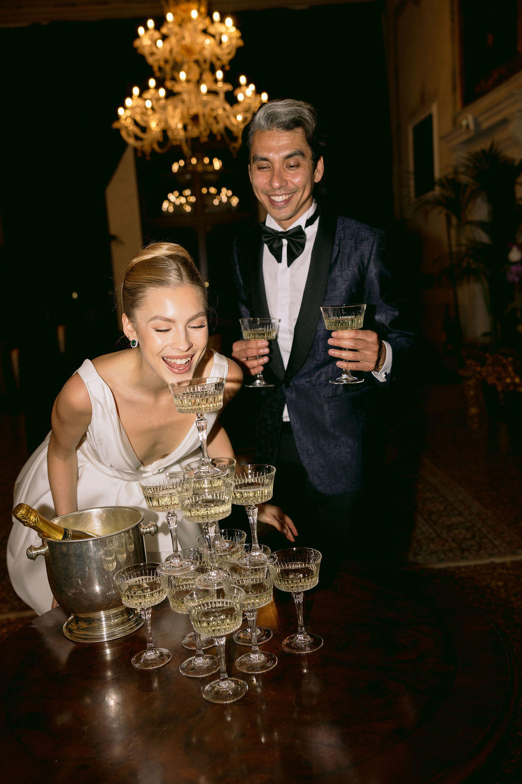 The shoot moves from natural afternoon light into evening, using flash as fashion editorials do—deliberately to capture texture and movement without overwhelming the frame. Daniela Katia's photography alternates between the two, creating images that feel pulled from cinema and red carpet moments. Diego Napoleone Films captured it all on video, with editing by Roberta Ingrasci, building a narrative that treats elopement as something intentional rather than impulsive. A modern fuga d'amore.